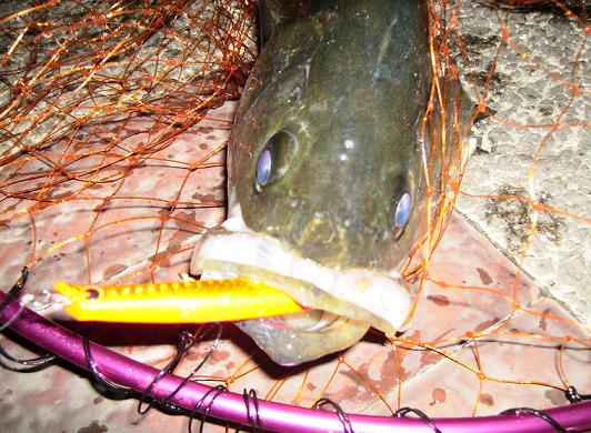 HAHAHAHAHA出かける時は~?( ゚Д゚)<ワッスレズニー小次郎敗れたり!何故コモスリ95を持ってない!とその昔伝説の剣豪も叫んだとか叫ばないとか。横浜湾奥では年初から5月末までは手放せないルアーです。もちろん飛びませんそうです飛ばす必要がそれほど無いと思ってください。細いシンキングペンシルで十分?いえいえ、デッドスローで水面のレンジをキープ出来るのはこれだけです。極めて軽少なシルエットが生み出す微細な水面波紋が欲しいのですそしてフラフラ、フワフワと放っておいても動き続けるギリギリの安定性。今の横浜湾奥はちょっとややこしい状況バチが抜けてないよーベイトフィッシュの位置が解らないよー明暗と言うよりも橋脚に着いてるのしか狙って釣れない感じがしました。そんな中で多数のバイトを得られたのが壁撃ちです。スーサンやビーフリーズをジャークして引きずり出すような事を狙いましたけど0バイト同じ壁に対し今度はコモモスリム95をネットリとデッドスローで引いてやるこの時、固定重心のウェイトボールは前に移動させない止めないけど引きずらない三角の引き波じゃなくて微細な水面波紋を出し続ける様に巻いてくる。夜光虫の量が凄かった青白い光がルアーを追ってくるシーバスがルアーに反応すると真っ黒い水に青い航跡が残る普段は見る事が出来ない魚の反応魚は沢山いるのに如何にルアーは見切られているのか思い知る頻発するミスバイト青い残像が交錯しルアーの通った後で水面に波紋が踊る。否ミスバイトにあらず失敗したのは自分、ミスリトリーブである。ベストを求めるショートバイトをとろうとなんてしない、エラ荒いでバレるのはバイトが不完全だからミスを繰り返しながら補正していくカラーローテーションも小まめにしていく面倒くさがったらそこでやめたほうが良い時間の無駄オックスブラッドとアカキンに集中しチャートバックイエローは今日は全然ダメだった。いくつかの注意点として ゆっくりでもいいので流れがある壁がいいのはスーサンの時と同様だし明暗が色濃く出ているコントラストの強い壁の方が断然釣り易いのも同様だ。 そしてその流れと順目、同じ方向に引いてくるのが一つのコツかもしれない。 流れにぶつけてはダメと言うこと。数度のバラシも本当に面白かった水面を物凄い勢いで右に左に飛び回るシーバスは戦闘機の様に闇夜を移す黒いキャンパスに青白い航跡を無数に残す。エラ洗いを楽しめるバラす心配の必要が無い最高のBITEまるでパイプをくゆらすGHQ、マッカーサー元帥のようです。フロント2本、リア1本の万全のハーモニカポジション楽しくてやり続けてしまった何か流れがないなぁと思ったら上げ止まりの2時半でした。そろそろ小バチ、難敵の高速遊泳型にボイルするシーバスが始まりそうですがなんなの?この冬の寒さは(;´д`)