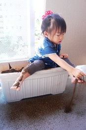 午前中は室内遊びで過ごしていたムスメお昼ごはんを食たら外へ行きたくなってきたようなのでベランダに出してあげましたムスメはブラシでごしごし掃除してみたり サンダルを履いてみたり 行ったり来たりで大忙しそのうちプランターに座りだしたムスメ土をサラサラ~ッ サラサラ~ッ一瞬ギャー!と思ったけど集中して遊んでいるし まぁいっか♪今日は公園に連れて行ってあげなくてゴメンネ 明日は公園に行こうね^^後片付けはオットにお願いしようっと^^;