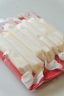 お引越しされるお友達に角型で焼いてスティック状に切ってまではなんとかしかしワックスペーパーに包むのがむずかしい!両端をねじっているうちにつるつると巻き戻ってしまいなかなか包めない皆さんどうやって包んでいるのか適当になんとなく包みました少しですがお世話になったお礼の気持ちです^^