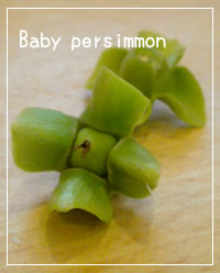 保育園の帰りに生えている柿の木。葉が生えて、白い花が咲いて…子供と一緒に観察してます。木の下になにやら落ちているので拾ってみたら柿の赤ちゃんでした~。(たぶん、だって見るのはじめてだもん)これが大きくなって柿になるんだ。(たぶん)