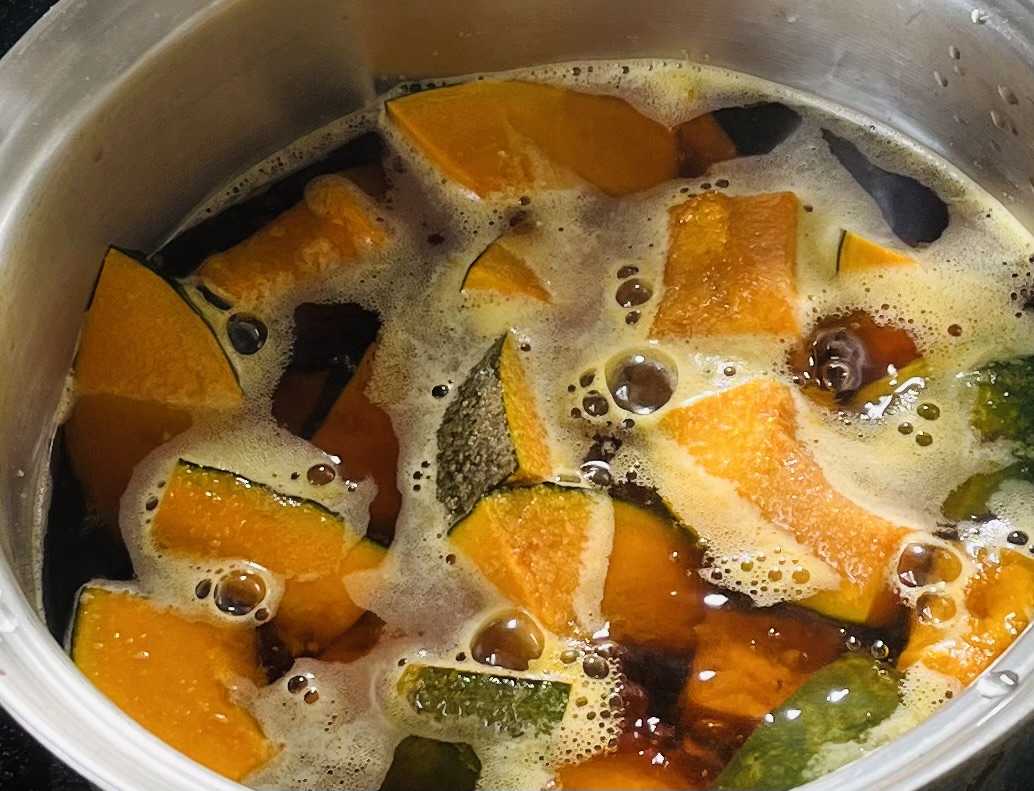 かぼちゃの煮物が食べたくて、かぼちゃも買ったよ。甘いのが食べたかったから、砂糖多め。はやく冷やして食べたい〜。