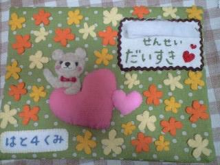 お久しぶりです。金曜日の夜から義実家に来ています。義実家のパソコンからでーす。金曜日は楽友さんとおデートしましたぁーーーこの内容はまた次回。 先週からも幼稚園のアルバム作りで締め切りもあって忙しくしてました。 一年間お世話になった先生に渡すアルバムのカバーを作る係だったので、がんばりました。33人のクラスなのでクマのまわりに花を33フェルトで縫いつけたり、内側はクラスのみんなのなまえを刺繍して縫い付けたり・・・けっこうギリギリまでかかってなんとかできました。 お兄ちゃんのページも作って、やっと完成しました。月曜日に先生に渡すらしいです。私は、人前で話すのは苦手なので、お友達にお願いしますが・・・ 喜んでくれるといいなーーー。 では出かけてくるのでまた今度ーーー ではでは。