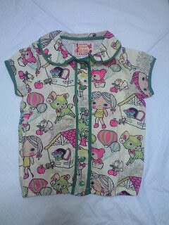 こんばんはーーー。今日買ったレトロ柄ブラウスなんかサイズが小さい気がして(娘連れて行けばよかったかな・・??)4と5を買ってきました。早速試着してみました娘はボタンのあるシャツに慣れていないため、嫌がりながらもお菓子でつって頑張りました身長86センチ13キロです。逆光でしかもケイタイなので見にくいけど・・・ホワイト 4ピンク 5着てた服で試着したのでコーデはスルーで・・ ボタンもちゃんとさせてくれなかったのでこんなんだけど・・・ 娘はすごくお腹出てるので4を着せるときに、ボタンが閉めづらかった・・なんかちょっと小さく感じたよでも5だと、背中部分がもわっとしてて大きく感じたの・・・(バイクにのってるヒトの背中みたいに・・ってわかるかな???)どちらかは手放すつもりでいます。私は本当はイエローが良かったけど、ホワイト見たらホワイトは、ふちがグリーンでかわいかったのでホワイトを着せたい・・けどボタンキツキツだと困るな・・って思ったりで、また自宅でゆっくり試着してみて決めたいと思っています。 私の行ったセレクトさんにはあとイエロー2とグリーンの2グリーンの8?か7が各一着ずつあったよ。でも発送はやってないんだって・・・私も取りにいけたら良いんだけど明日自宅に戻るのでダメなんだぁ・・すみませんどっちにしたかまた日記にUPしますのでしばしお待ちをーーーっっっおやすみなさいーー