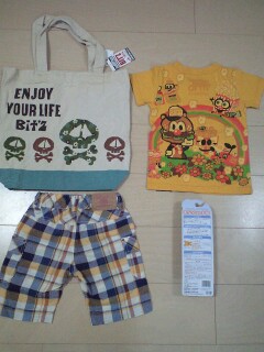 なかなか決まらないのでもう一度お願いしまーーす★全て未使用新品です。1・Bit'z、トート(使おうと思ってたのに使う時がありませんでした…)2・JAM、レインボーTマスタード100(タグは店舗にて回収、試着もしてません)3・F.O. チェックパンツ110(サラッとしていて夏に大活躍だと思います)4・Babyプーのエジソンのお箸、左手用(間違えて左手用を買ってしまいました…?)以上です。okaitori優先しますが、交換でも大丈夫です。日用品、雑貨何でもOKりんごの雑貨が好きです。子供服は、JAM、グラ、ゴッサム、JUNKなどが好きです。女の子100~、男の子120~。他のものでも気に入れば大丈夫なので、是非メッセ下さい。よろしくお願いします~☆