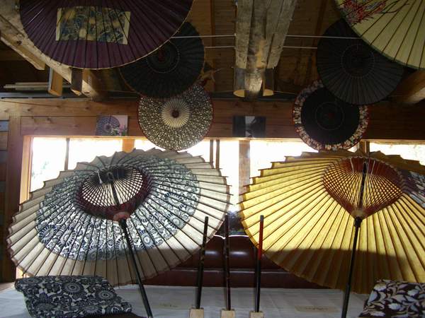 その新緑を背にし開かれる和傘の花