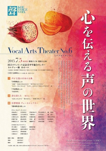 今、とっても行きたい!以前から気になっていた磯貝メソッド。内容も関心のあるものばかり。5日は4時半から新橋演舞場なので、最後まで居られなさそうなのがつらいところ。きちんとした日本語を話せるおばあちゃんになるのが夢なので申し込んじゃおうかな~。 Vocal Arts Theater No.6 は、ヴォーカルアーティスト達によるパフォーマンスです。先ずは、味わい深い日本の古典作品を2作お届け致します。日本語はたて読みすると時空を超え生き生きとひびきます。私達は詩を読むのが得意です。朗読というより、人の心を声で歌い語ります。宮沢賢治ヴォーカルシアターの9作目は、「銀河鉄道の夜」です。夏のはじめに是非お来し下さり、お楽しみ下さい。■I 声が主役の日本の古典「伊勢物語」より“初冠” “奈良の京ははなれ” “京や住みうかりけむ”“むかし、をとこをんな” “むかし、はかなくて絶えにけるなか” 他「平家物語」より「敦盛最期」■II 詩は訴える ―戦争はいやだ ―“生ましめんかな” “ 象のはなし” “ 原爆小景より” 他■III 宮澤賢治 ヴォーカルシアター『銀河鉄道の夜』より (ホームページより)4日はシンポジウムもあるので、興味のある方はこちらで確認してくださいね。
