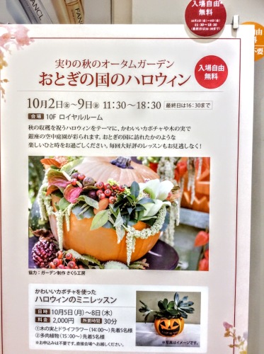 ハロウィンの時に来たのは はじめて実りの秋のオータムガーデン「おとぎの国のハロウィン」入場自由無料日時:10月2日(金)~10月9日(金)11:30~18:30(最終日は16:30まで)会場:10F ロイヤルルーム秋の収穫を祝うハロウィンをテーマに、かわいいカボチャや木の実で銀座の空中庭園が彩られます。(サイトの挨拶文)おとぎの国に訪れたかのような楽しいひと時をお過ごしください。 (サイトの挨拶文)毎回大好評のレッスンもお見逃しなく! (サイトの挨拶文)
