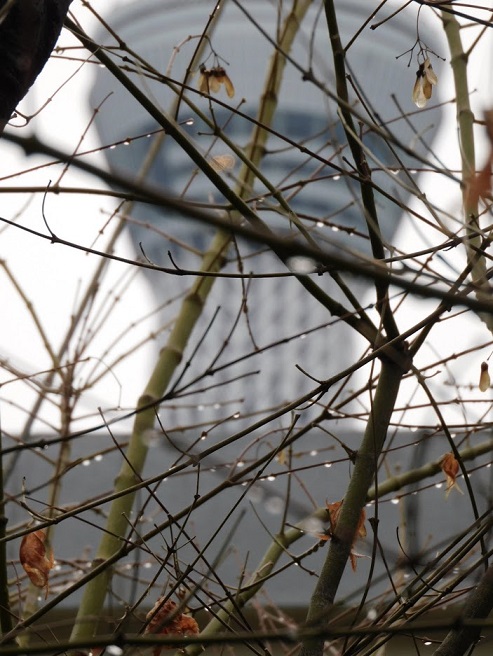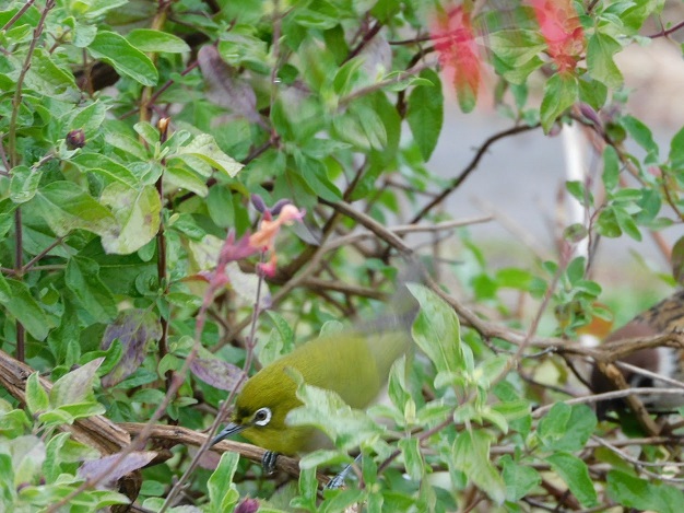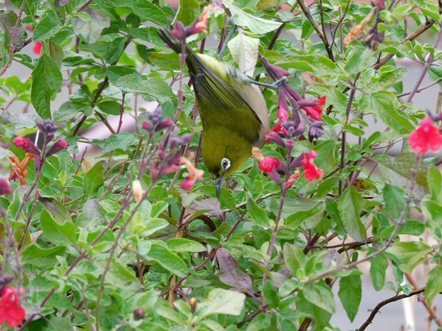 細い枝に器用にぶら下がりながら蜜を吸っていました。