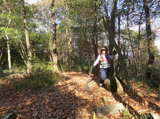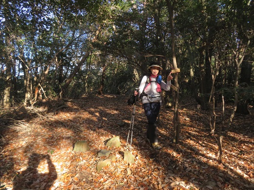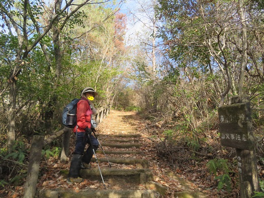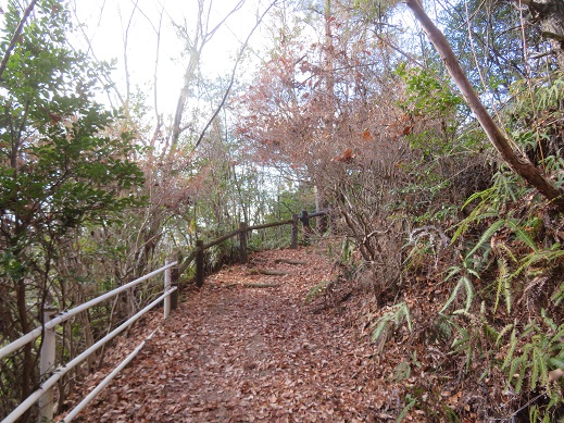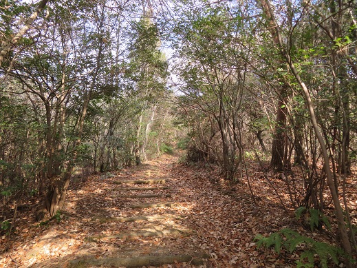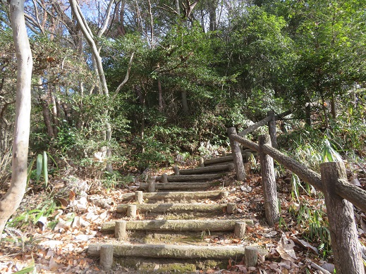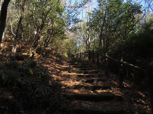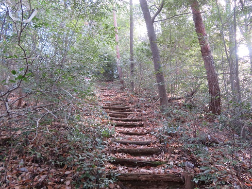 自然林の落ち葉を踏みながら、緩やかな階段を登ってゆく