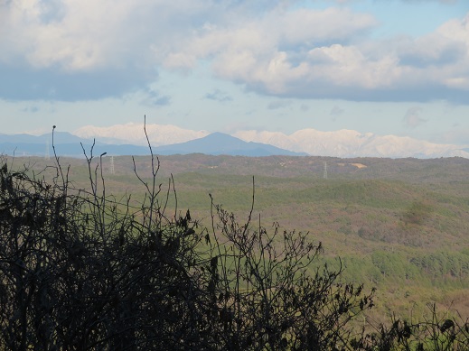 笠置山の後ろには雪の中央アルプスが見えています。