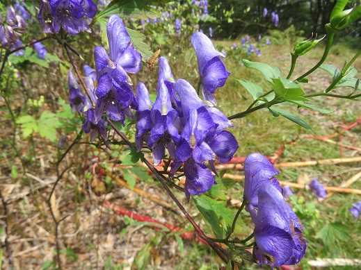 私の中では碁盤石山の花はトリカブトです。27日(土)西納庫登山口から登ります。10mほど斜面を登ったら稜線の合流点に到着左は面の木園地へ、碁盤石山へは右です。今日は爽やかで、登山日和です。一本道の尾根を行きます足元にはほとんど花が終わったママコナ感じの良い稜線歩き階段を一気に下ったら木戸洞峠です。木戸洞峠の少し日の当たる広場にいつもトリカブトの群生があります。今年も咲いていました。これで富士見岩のトリカブトが咲いているのがわかります。咲き始めなので枯れた花も無く、蕾もいっぱいあるのでとても綺麗です。木戸洞峠から碁盤石山山頂へ一気に登ります。水平なところが無く、ひたすら登ります。途中で山栗拾いして遊んでいました。山頂が見えてきた碁盤石山山頂(1189m)二等三角点も有ります。途中ですれ違った人は単独の男性追い越していった人は単独の男性と一組のカップル今日は珍しく人に出会います。お茶を飲んで少し休憩して、富士見岩の方へ前進します。山頂から少し下ると、尾根に水場の標識尾根の上から谷の水場をズームで写してお水が流れています。山頂に何も施設が無いから、ここの水はきれいでしょうね私の好きな尾根ブナ林は良い感じですシカが飛び出してきそうな景色です。いよいよ、目の前のピークがトリカブトが咲いている所トリカブト(キンポウゲ科 トリカブト属)アセビの大木の周りはトリカブトの群生です。初めて登った時は1995年12月でその後何度も冬から春にかけて登っていますが、この花の時期に来たことが無く、これほどの群生は2023年9月30日に登った時に初めて知りました。この花を見たくて、この時期に最近は登っています。以前はこの群生地に碁盤石山山頂という看板が有りました。だから初めて東納庫登山口から登った時は、ここが山頂だと思って、本当の今の山頂には行かずに下山したのです。次はアセビの森を越えて大好きなモミジの森を歩きます。モミジの森を振り返ってまたまた、富士見岩の手前にもトリカブトの群生地こんなに綺麗ですが猛毒の花です。富士見岩この岩の上から富士山が見えたとか・・・この近くの段戸山の山頂から富士山が見えたので、まんざら嘘でもないでしょう。平山明神山、大鈴山、右端は鹿島山ズームアウトしたら一番奥に三ツ瀬明神山その右の一番奥に宇連山富士見岩の近くの木陰でお昼ご飯を頂いて食後の飲み物もゆっくり楽しんで、天狗の奥庭まで下りましょう。碁盤石の横に、以前は碁盤石山の謂れの看板が有りましたが今は朽ちて落ちています。昔の写真(2006年3月)です。味のある文字で掘られた説明文です。天狗がひっくり返した碁盤の石が点在しています。碁盤石山の磐座(いわくら)この辺りにもいっぱいトリカブト昔の山頂だといわれたところまで戻ってもう一度トリカブトの群生を見て帰りましょう。碁盤石山の山頂に向かって急斜面の階段を登ります。階段の途中で振り返ったら樹間から富士見岩のピークのシルエット碁盤石山の山頂を下って、木戸洞峠を越えて最後の登りのこの階段は102段車の駐車させている西納庫登山口への分岐を通り過ぎて面の木園地の方へ少し歩いてみたのです。茶臼山高原道路を左下に見ながら緩やかに登ったり下ったり面の木園地の手前のトンネルの手前までやってきました。この尾根の下が茶臼山高原道路のトンネルですが、今日はここまでです。富士見岩のあたりでのんびりしすぎたので井山から面の木園地へ行く時間は有りませんから引き返して登山口まで戻ります。今日は予想通りトリカブトの満開を見ることが出来ました。大好きな碁盤石山山頂から富士見岩までのブナ林やモミジの林もいい感じで何度来ても碁盤石山は好きな山です。