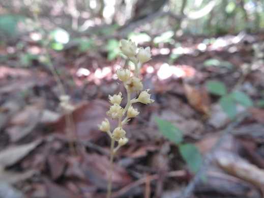 サクライソウ27日(日)お天気が良いのはうれしいけれど、暑い日が続いています。日本で一番暑いところにもなった多治見市から登る、浅間山に登ってきました。登山口は多治見市ですが、山頂は可児市になる浅間山。ここには絶滅危惧種のサクライソウが咲くというので真夏の暑い時期の低山は、ただ暑いだけなのできついのですが頑張って登ってきました。登山口は小名田緑地、特養陶生苑の横にある小さな公園に車を停めて歩きます。特養ホームの横の舗装道路を歩きますが、舗装道路の照り返しでメチャクチャ暑くて、すぐに汗が噴き出ます。ここが日本一暑い町にもなった多治見だとここで改めて感心することしきり。道路の突き当りの配水池のゲートが出てきたら山に入ります。早くあの木陰に入りたいよ~~山腹を巻く細い道ですがしっかり踏まれています。木陰はギラギラ太陽から日差しをさえぎられるのですが風が無く暑い暑い林道に出るのですが、右の方へ歩いてしまって鉄塔のあるピークに来て山頂と反対側だと気が付いて戻ります。あまりの暑さに少し気分が悪くなって、林道の木陰でしばらく横になっていました。林道は突き当りになって、細い踏み跡を進みます。しっかり踏み跡があるので、たぶん山頂に行くのでしょう。もうすぐ山頂浅間山と書かれた古い標示と展望広場です。感じの良い浅間山山頂(372m)ほど良い広さの、岩場のある広場意外に貸切なのでテーブルを使わせてもらってランチです。南側が開けています。真正面の足元の住宅地は桜が丘の住宅地でしょう。一番奥の左のなだらかな山は岩巣山、猿投山はさらに奥の鉄塔がたくさんある山です。木陰でゆっくりお昼ご飯を頂いて展望を楽しみます。次は浅間神社へ向かいます。踏み跡は2ルートあって左のルートで行くことにします。赤い鳥居の広場に出ました。鳥居をくぐって進むと拝殿と本殿と広場が見えてきて後で知ったのですが7月にはこの神社の祭礼があったそうです。だから広場で何かを燃やした跡があったのですね。ここは海抜370m可児市で一番古い神社でコノハナサクヤ姫をお祀りしているそうです。富士浅間神社と同じですね。四隅をヒサカキで囲んでしめ縄が掛けられている石何でしょうね・・・サクライソウを探し回って山頂の展望地へ戻ります。もう一つのルートで山頂の展望地へ戻ります。今日は誰にも会わず貸し切りでした。同じ道を戻ります。浅間山(美濃富士)登るときは気が付かなかったのですが富士山のような三角錐の形ではなく、なだらかな山の形です。サクライソウは絶滅危惧種で、1903年岐阜県の恵那山で桜井半三郎氏により発見されました。植物学者の牧野富太郎氏が発見者の桜井氏の名前をとってサクライソウと名付けたそうです。1978年8月15日 この地の久々利のサクライソウ自生地が国指定天然記念物に指定され1996年1月25日 多治見市の高社山のサクライソウも市指定の天然記念物に指定されたのです。今年の正月の初登りで高社山に登った時に説明看板が有り、ぜひサクライソウを見てみたいと思ったのです。去年は真夏の暑い時に、岩巣山のミヤマウズラを見に行きましたが今年はサクライソウでした。初め探しても見つからず、あきらめかけましたがやっと二株見つけて、帰りかけたら普通に林道沿いに見つけてへェ~~こんなところに咲いているわ~~~さすが自生地です。サクライソウサクライソウ科 サクライソウ属多年草の葉緑素を持たない腐生植物背丈10センチくらいで、茎は1mmほど、花は2~3,4mmピントがなかなか合いません。10センチくらいで目立たないのでサンバイザーを後ろに置いてみました。右後ろにも1本咲いています。ほとんど白に近いクリーム色です。ほとんど絶滅に近い植物なので、もし興味があるなら不用意に林床を踏み荒らさないように気を付けて会いに行ってくださいね。