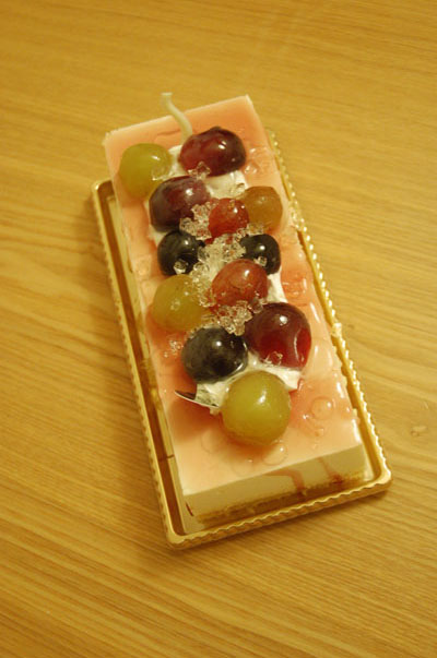 あ~みなさんお久しぶりですコメントのお返事が遅くなってしまいました。別にそれほど忙しかったわけじゃないのに・・反省その間、結婚記念日に誕生日といろいろとイベントがありました~。1年の早い事早い事!ほとんど成長する事もなく、というか成長どころかむしろ退化したかも来年の誕生日には1年頑張ったな~と思いたいなで、誕生日前日の夜にドラベエが・・「誕生日の前夜祭しよう」と新宿高野でチーズケーキを買って来てくれました「うわーい!! あれ、しっぽが生えてる・・と、トカゲ?あれ・・ワニかな? なんだろう・・・?? わかんないけど美味しそう」(ころぽん)「え・・? ブドウだよ」(ドラベエ)「ア ブドウだ! ガーン」(ころぽん)作った人ごめんなさい。みなさんはすぐわかりましたか?だいたい、誰がトカゲの載ったケーキなんか作るんだよ後から考えるとどう見たってブドウだ。くだもの屋さんのケーキとあって、ブドウが美味しくって感動でした!ここのケーキは絶対失敗しないんだよね。フルーツが美味しいからその後、ドラベエがケーキをじいっと見ながら「あれ、何か足りない・・」????「あ!!プレートがない!」 で、ケーキの箱の中を見てみたらケーキの上に乗ってるはずの「ころぽんちゃん、お誕生日おめでとう!」のプレートが横たわっていた誕生日プレゼントは・・・私が欲しがってたニコンのデジカメありがと、大事にしまーすお父さんから素敵なバングルが届きましたみんなありがとう