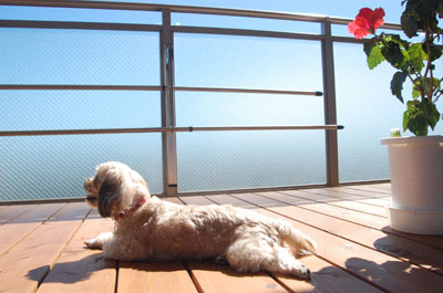 家族全員のお気に入りの場所でーす。ぽかぽか陽気の日は寝転んでお昼寝&読書。引っ越してからベランダで過ごす時間がとっても長~いよ。悩んで悩んで迷って迷った末に注文したウッドデッキ。今迷ってる人には是非お勧めしたいです。新築でマンションを購入するとオプション会があって限りない数のオプションからいろいろな選択をする事が出来る。オプション会で頼むと家にぴったりの物を入居前に設置してもらえるのがメリットかな。だけど、どれも高ーいの。ひと手間かければ家電量販店やホームセンターで安価に購入出来るものが殆ど。ケチ、じゃなかった倹約家のわれわれ夫婦は出来る限り自分達でやろうと吟味に吟味を重ね、ガスレンジのグレードアップと値段が他とさほど変わらなかった換気扇フィルター、そしてそして・・崖から飛び降りたつもりでベランダの『ウッドデッキ』を申し込んだ。崖から飛び降りたつもり・・というのはこのウッドデッキ、うちの愛車が3、5台買えてしまう値段なのデス。逆にどんな安い車に乗ってるんだ?!とびっくりだけど、とにかく走りもしない単純な造りのウッドデッキが3、5倍もするなんて値段を聞いた時はひっくり返りそうだった。でもでも、思い切って良かったです。満足満足。耐久年数は10年らしいけど頑張ってメンテナンスして20年は持たせるぞー!買い替える頃にはもっと安く出来る様になっていると良いなあ我が家一押しの癒しスポットです!