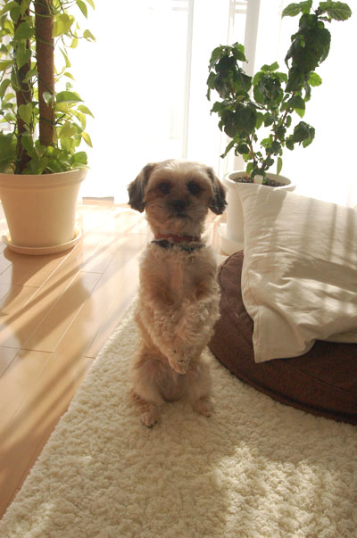 以前日記に書いたように、私が会社へ行くようになりアチャプウは昼間ハウスでお留守番をする事になった。で、夜までハウスだと何だかかわいそう..と、私たち夫婦のダブルベッドの隣にワンコ用のベッドを置いて同じ部屋で寝る事にしたダーリンはいつも夜更かしなので先に寝る私が「アチャプウもう寝よっか?」と声をかけると『待ってました』と言わんばかりに嬉しそうにトコトコト~っと私の後を追ってくる。で、私はベッド、アチャプウは自分のベッドに入るのだ。その後・・ダーリンが遅れてベッドへ入って来ると・・。さっきまで自分のベッドで機嫌良く寝ていたアチャプウが素早い身のこなしでシュタっと私たちのベッドの上に飛び乗り、私の顔の上をシャッとまたぎ(たまに顔を蹴られる)、私とダーリンの間にぐりぐりと無理やり入ってくる。で、追い出そうとするとシーツにしがみつき岩の様に固まって絶対に動かない。しょうがないのでアチャプウを中心に3人すごい密着して眠る事になる。あの小ささでスゴイパワ―。スゴイ頑固さなのだ。で、気がつけば朝・・・・。みるとアチャプウは必ず自分のベッドでスヤスヤ寝ている。一体何を考えてるのやら。