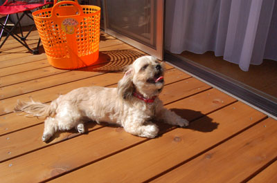 お久しぶりです~。引越後片付けして地域を探検していました。えへへ。さてさてやっと移り住んだ新居。感想は・・・う~感無量です!ドラベエありがとう!気に入った地域や部屋に住むって大事なんだね。引っ越して良くわかったよ。ここは『キャンプ場の中にかわいい小さな町がポン!っと現れた』って雰囲気の町です。緑の中に住まわせてもらってるといった感じ。気持ちよい空気が流れてます。木や自然が大好きな私たちはもう夢中~。毎日違うルートを通ってお散歩。みんな早寝早起きで(すこ~し)活動的になりました。自分の家と思うと掃除も楽しくできるし、家にいる時のストレスも少ないよ。アチャプウも気に入ったらしい。心なしか前より顔つきが優しくのほほん♪としています。おやつで釣られないとしなかった「ハウス」も今では素直に「はいはい~」と入るようになったし、不思議~。うわ~ベランダでひとり笑ってる所を発見。あやし~どんだけリラックスしてるねん。さて、ここでどんな歴史が作られて行くのかな、がんばらないとね~。
