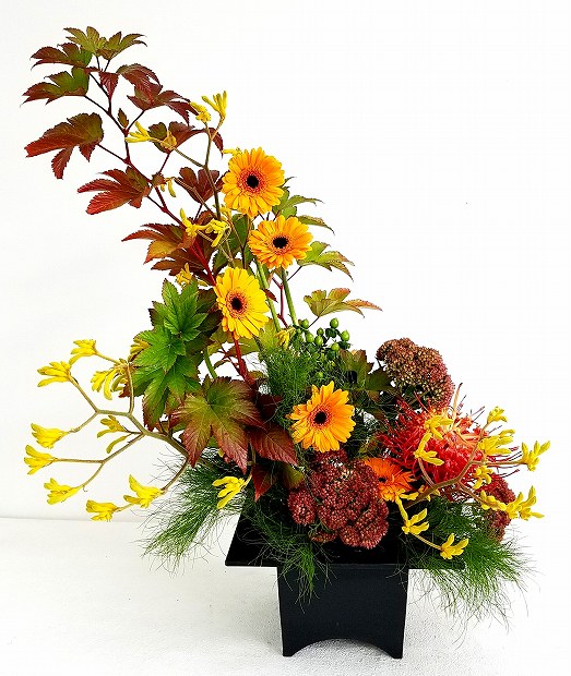 生徒様達のフラワーアレンジから秋色のアレンジメントレッスン作品。オレンジや黄色は、秋をイメージします。キイチゴの黄葉を基に花色の濃淡で、まとめてあります。デザインは、斜めのラインを表現するスラントスタイル。シャープな印象も受け、オシャレな感じですね。カンガルーポー(黄色)や、ピンクッションなど花もちよい花材を多く使って少しでも長く楽しめるようにと組んでみました。こちらはピンクを基調カラーとしてコーディネートしてあります。その中にも、ワインカラーのトルコキキョウを入れて色合いに深みと、秋の風情を意識してみました。形は基本的な、トライアングルスタイル。安定感のある形にアレンジできましたね。細かい花はワックスフラワー、ディスプレーによって色味がことなるかもしれませんが、少し落ち着いたピンクだったような・・・花のサイズや形がいろんなものを組み合わせると調和しやすいですね。にほんブログ村ご訪問有難うございます。お手数ですがクリックよろしくお願いします。