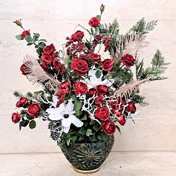 アーティフィシャルフラワー(造花)でビルのエントランスに季節ごとにアレンジのご依頼をいただいています。クリスマスモードの12月から1月いっぱいぐらいまで飾るので、暖かく華やかな印象を心がけています。今回は、赤薔薇中心にアレンジしました。私の住む市の一等地にある女性がオーナーのオフィスビル。出入りの皆様方に、季節を感じて頂けるといいな~と思っています。にほんブログ村ご訪問有難うございます。お手数ですがクリックよろしくお願いします。
