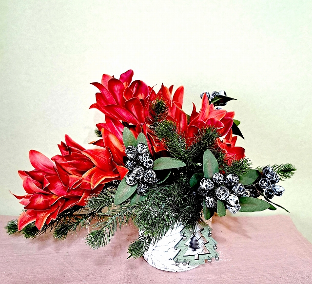 アーティフィシャルフラワー(造花)でクリスマスから2月ごろまで飾るアレンジをご希望の生徒さまのレッスン作品。シンビジウムとコニファー、クリスマスオーナメントも外せるようにして使ってあります。シックな色目のシンビジウムも高級感ありますし木の実も、存在感ありますね。すべてアーティフィシャルフラワーです。こちらは、生徒様ご自身の美容室に飾られるアレンジ。お客様は、よくフレッシュフラワー(生花)と間違えるそうです。(^▽^)/そして、こちらは小さなリースを使ったアレンジメント。お友達にプレゼントの作品ですがいい感じに仕上がって、喜ばれることでしょうね。ポインセチアは切り花としては水揚げが難しいので、鉢花としてたのしむか、アレンジに使うのはアーティフィシャルが適していますね。こちらも同じようにポインセチアを使ってミニアレンジ。ガラスの器にはクリスマスオーナメントが使われています。実はグリーンはコニファー・ブルーバードというフレッシュグリーンを使いポインセチアはアーティフィシャルでドライの木の実を添えています。素材はミックスですが(生花と造花)(^^)トータルで楽しめます。グリーンは生なので、 コップにお水を入れて長く楽しんでいただけます。にほんブログ村ご訪問有難うございます。お手数ですがクリックよろしくお願いします。