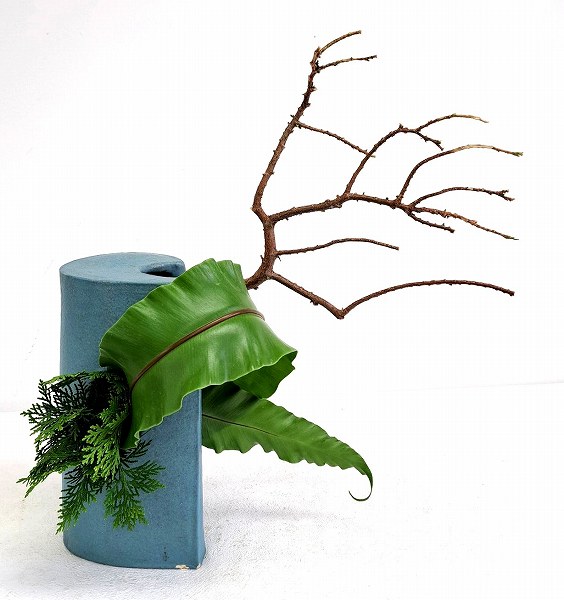 分解と再構成というテーマでヒバを枝と葉に切り分けて使ってあります。葉は、タニワタリ。通常、主役的につかうお花を敢えて使わずにしっかり、活け手の主張したいコンセプトが表現してあります、ね。こちらは、ヒバの表情を見極めインパクトが大きいプロテアを活けてあります。植物、自然なそのままでも、もちろん美しいのですが今回のように、ヒバをしっかり見つめて植物と対話して・・・表現することがいけばなの大きな楽しみです。器とのバランスもバッチリ!器選びは、いけばなの大きな要素となります。こちらはタニワタリの大きめの葉をクルリンと丸めて使っています。プロテアの大振りのお花にバランスよく活けてあります。深いタイプの器を使ったのもスッキリまとまりを感じさせて、良かったですね。にほんブログ村ご訪問有難うございます。お手数ですがクリックよろしくお願いします。