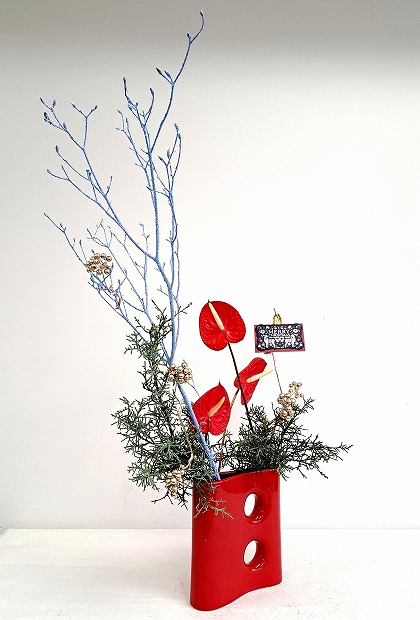 いけばなでクリスマス☆ということで・・・(^▽^)キラキラ塗り木と コニファー・ブルーアイス、アンセリウムを、赤い器にいけてくださいました。季節感バッチリですね。金色に着色したドライのサンキライの実、そしてクリスマスカードを付けて一気にメリークリスマス~~☆こちらはクリスマスホーリーとアンセリウムとコニファー・ブルーアイスをつかって横長の床面も意識したいけ方です。赤い実がクリスマスですね。トゲトゲが控えめなヒイラギクリスマスホーリー。お庭にあると、この時期重宝しますね。それなりに棘も感じるので防犯効果も?あるかも。普通のヒイラギよりは優しいですけどね。こちらは、併合花型というスタイルで2つの花器にふたつの花型を活けて2つで、ひとつの作品です。緑はクジャクヒバを使っています。目立たないですが、ゴールドサンキライを使って華やかさも演出。12月はクリスマスとお正月、お花も飾り映えするシーズンです。いけばなレッスンも楽しんで頂けるとうれしいなと、毎年、そろばん片手に(現実は必死で暗算)やりくりしつつ少しでも華やかに!オシャレにと 花材選びとオーナメントを考えます。にほんブログ村ご訪問有難うございます。お手数ですがクリックよろしくお願いします。