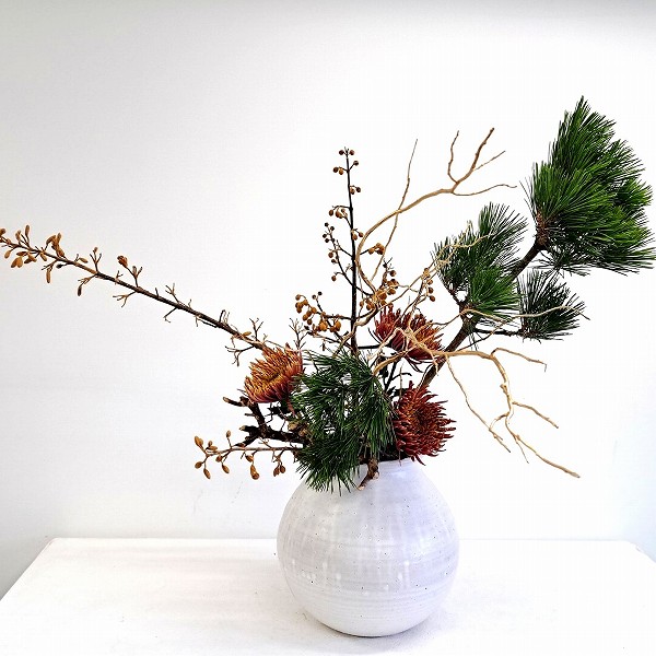 新春生け花、生徒様達の作品をご紹介させてくださいね。山光松(さんこうまつ)と雲竜柳ゴールド、桐、そして菊(ディスバットマム)ディスバッドマムとは、1つの茎に1輪花がついているタイプの洋ギクのこと。つまり一本の茎に脇芽を外して一輪だけ咲かせた洋菊。雲竜柳の自由に暴れた線が金色に光って、面白みがありますね。桐の直線的なラインと雲竜柳のラインと、二つのラインを組み合わせるのが今回は難しかったと思いますが・・・上手に表現なさっていると思います。二作目は、鉄花器に同じ花材を活けてありますが、こちらの桐は、ごらんのように、大きなカーブを描いています。自然の植物なので、一つとして同じ枝はないわけで・・・その日のお花とよく対話して(^▽^)表現したいラインを探し活けていくのが生け花の醍醐味ですね。紅白のクラフトテープを絡ませて菊のグリーンを際立たせています。3作品目はちょっと変わった色合いの花瓶に正月花を活けて、モダンな感じになりましたね。クラフトテープを下のほうまで垂らすことによって、作品と器の一体感が生まれました。菊(ディスバットマム)はいろんな色があって、さすが洋菊!ずっと以前にパリのホテルに飾ってあった洋菊の巨大さに驚いたことを思い出しました。菊は花持ちしますのでインテリアに使いやすいですしね・・・私たちの従来のイメージを変えてくれた洋菊、大好きです (^▽^)/にほんブログ村ご訪問有難うございます。お手数ですがクリックよろしくお願いします。