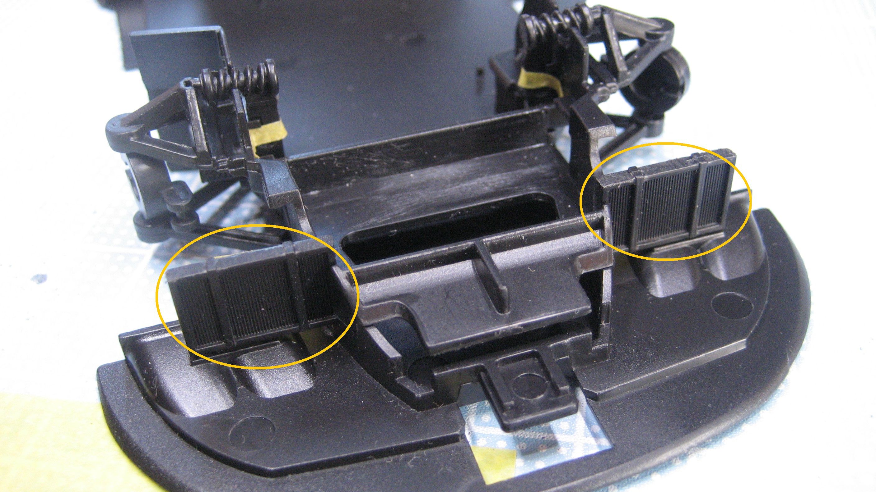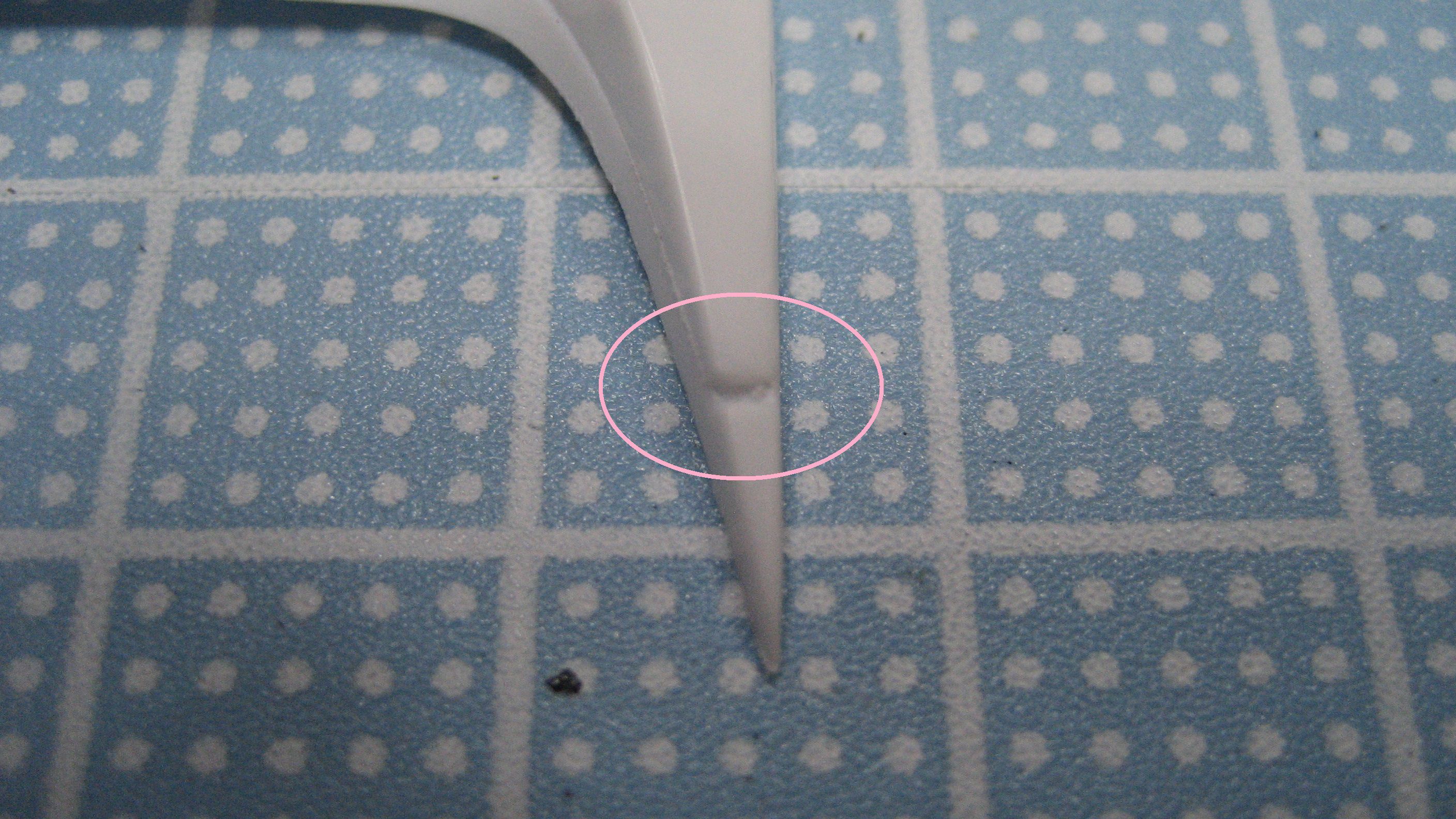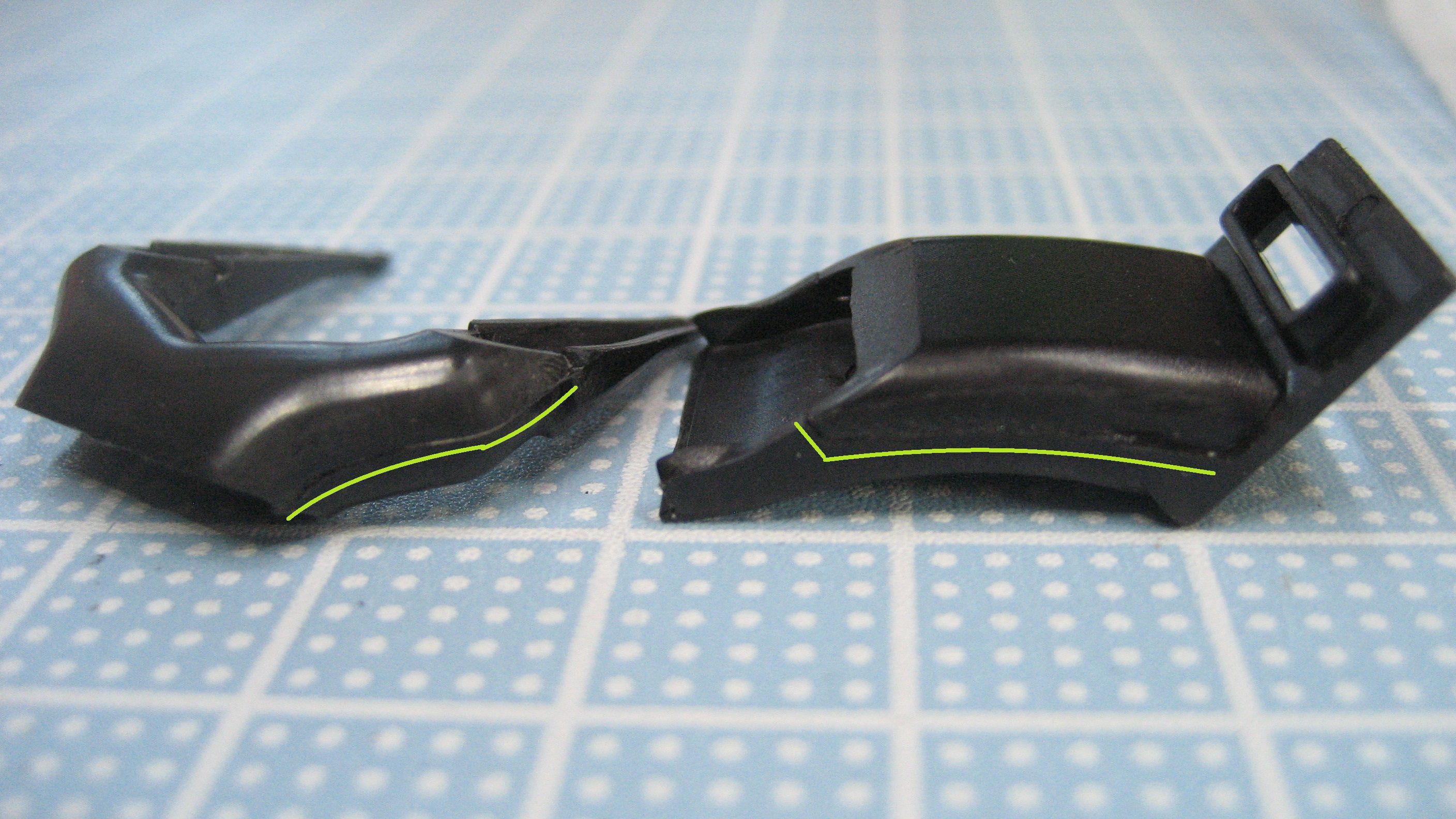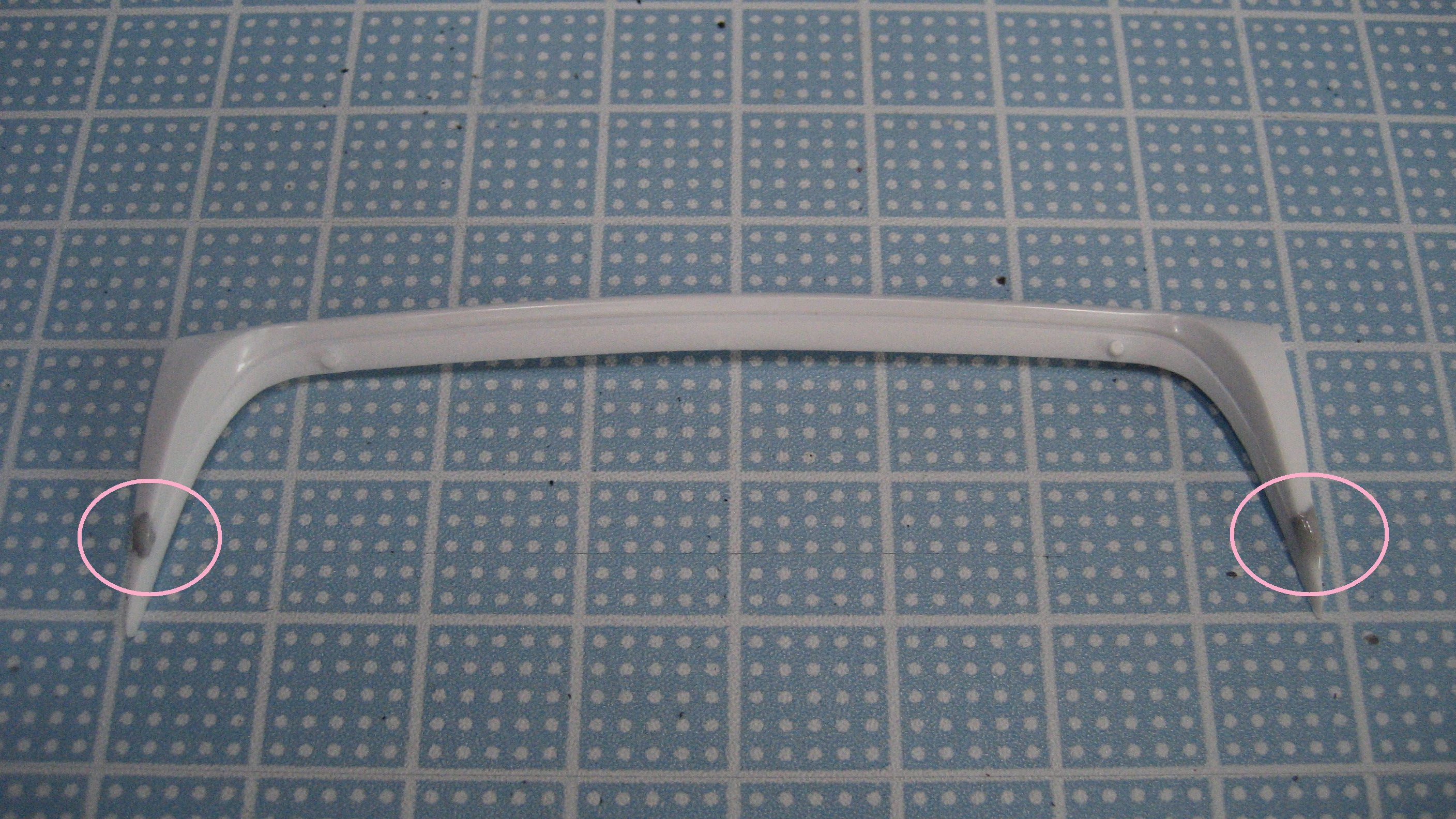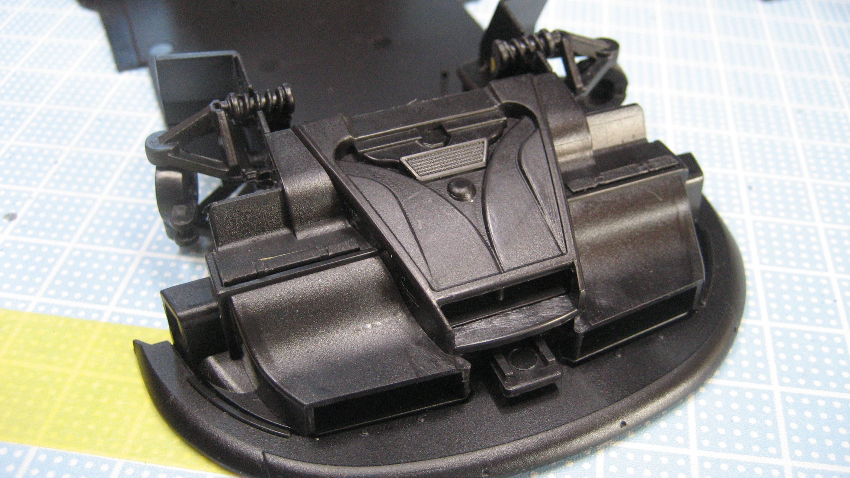 車体テールエンドの空力パーツ……ちょこっとですが合わせ目に凹みが生じます。一体成型にしてくれても良いのでしょうが2分割です。接着剤を使って組み立てることもプラモデル作りの醍醐味なのでしょうが、残念ながら面倒になってきた私です。駄目ですね~