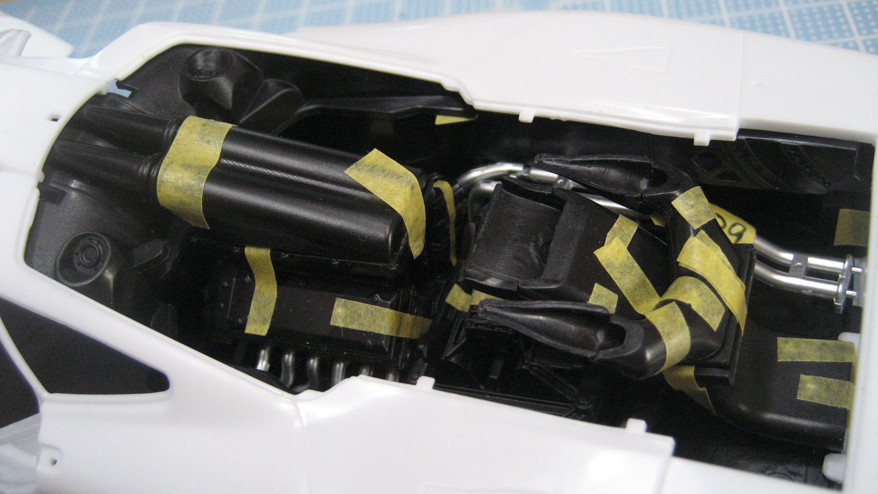 エンジンルーム上部には、ボディーをはめてからでないと取り付けられないオマケのパーツがまだまだあるようです。カーボンデカールはないし、どうやって表現すればよいのやら迷う物もあります。 おまけに、アオシマの指定通りに塗ったらへんちくりんになりそうな個所も??? 排気管は艶消しメッキパーツでよいのですが、切削部分が剥げてしまいましたし、実車はシルバー系ではなさそうなので一旦漂白剤で剥がしてから考えます。
