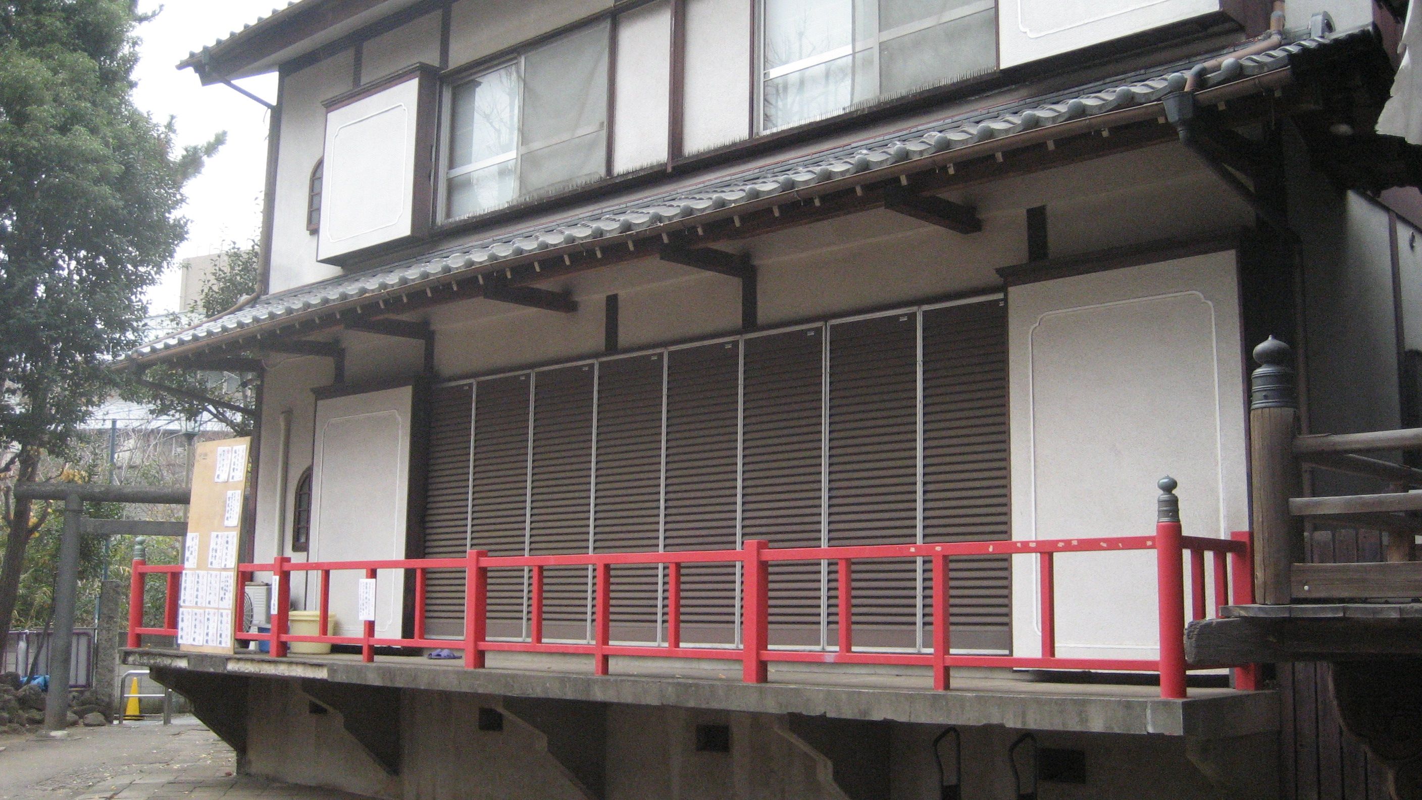 神楽殿でしょうか? 赤い手すりがあるのでそうなのでしょう……
