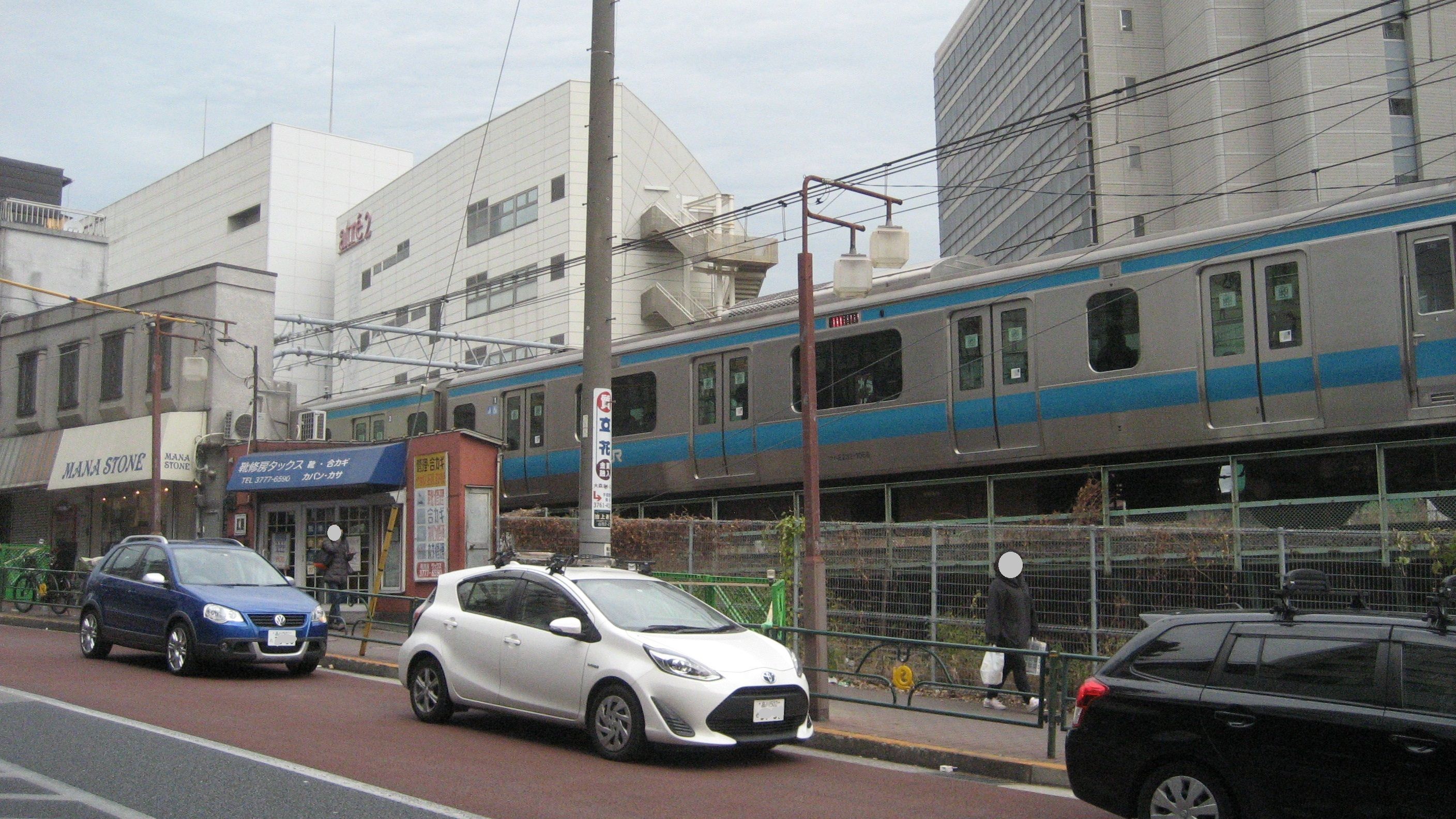 少しの間だけ、池上通りとJR線路が隣り合わせになります。通過中は京浜東北でしょうか? 最近、電車はタイミングよく走ってくれます。