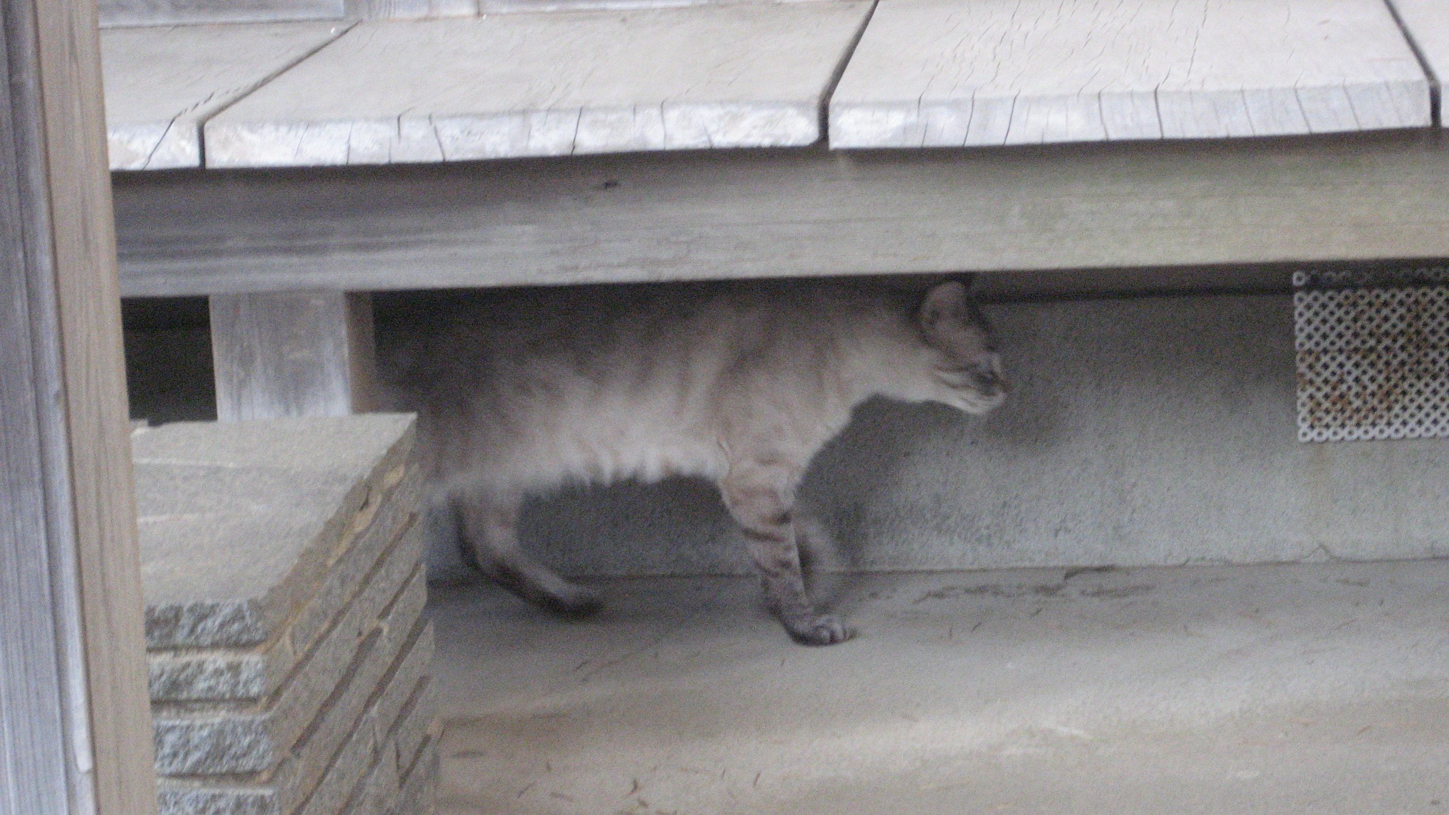 観音堂の下に猫発見……止まってくれないのでボケてますが……池の鯉は大丈夫かしら?
