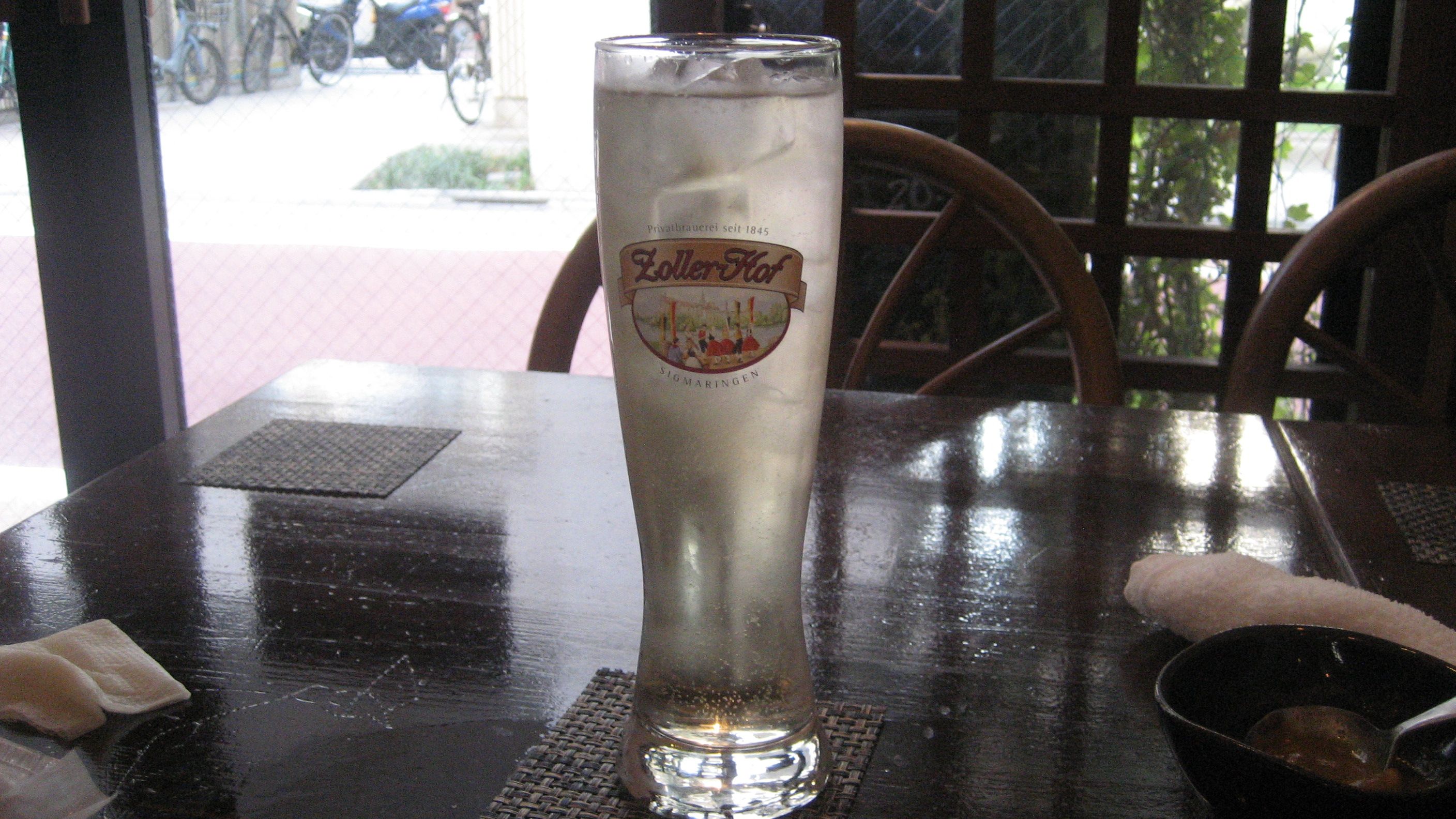 ビールにしては色が薄いでしょ……角のハイボールです。ビールはお腹が膨れちゃうし……角のジョッキで飲むのが日常ですが、こういうグラスで飲むのもちょっとお洒落かもしれませんね。