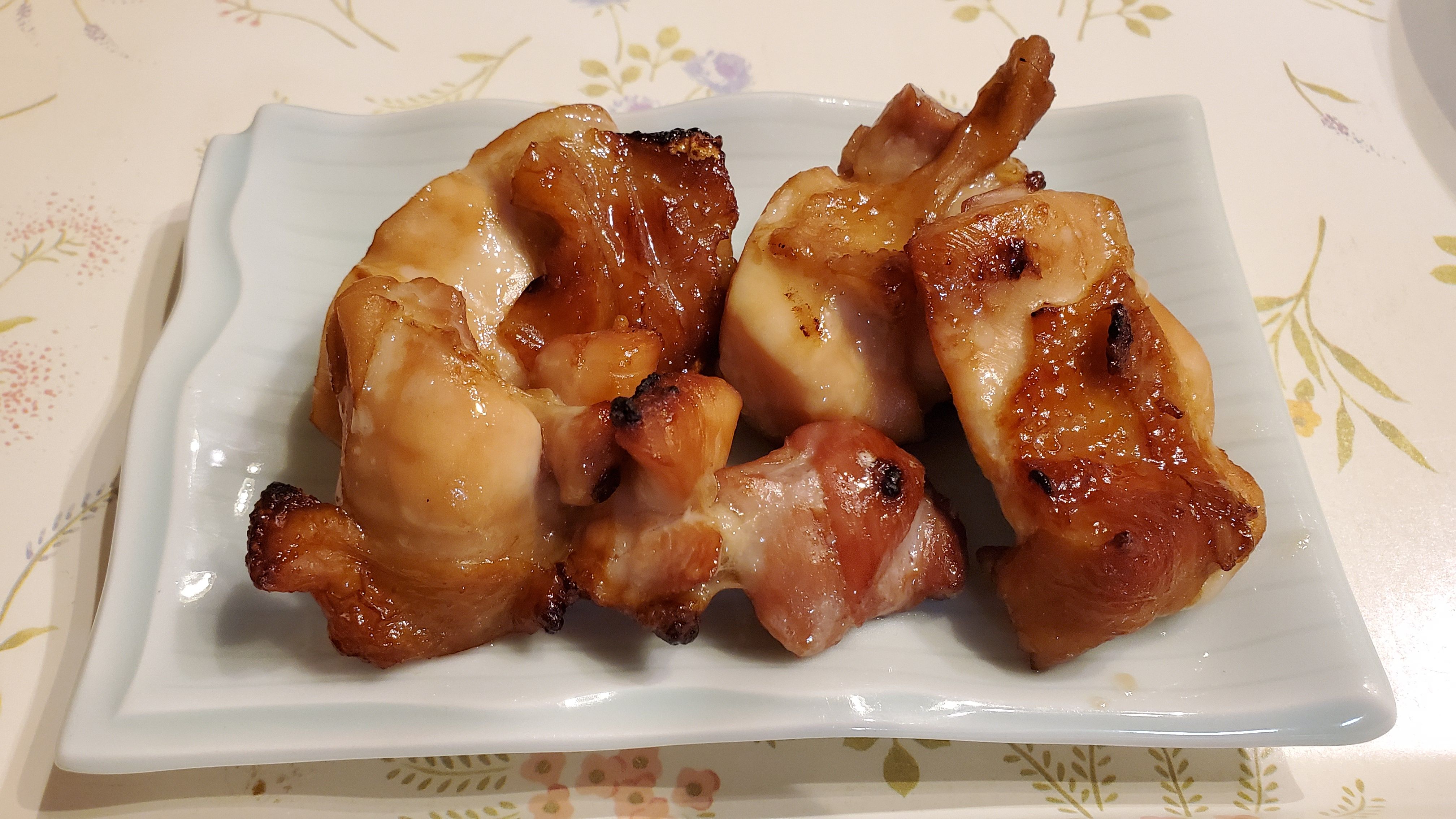 自家製焼鳥……簡単だから私の定番。シャワー前に味付け……潰したニンニクで鶏肉をなでなでして香り付け。酒と醤油に浸けて寝かせておきます。潰したニンニクも一緒に投入。あとは魚焼きグリルで焼くだけ……超簡単!!!