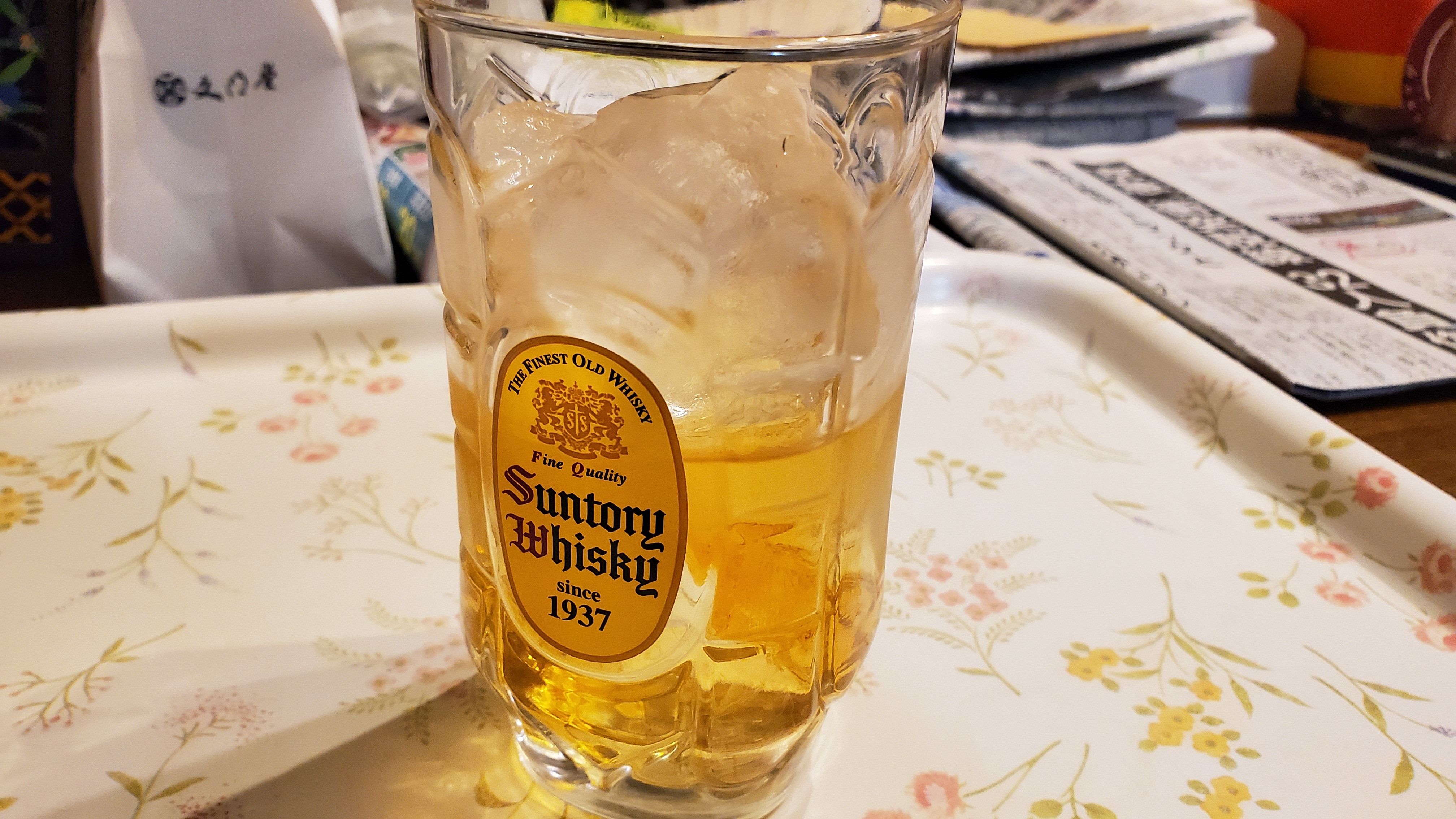自家製梅酒……シャワーを浴びてから、ロックを舐めながら材料を刻んで炒めました。ハイボールグラスですが、後で飲むからグラスは兼用……洗うの面倒だし……