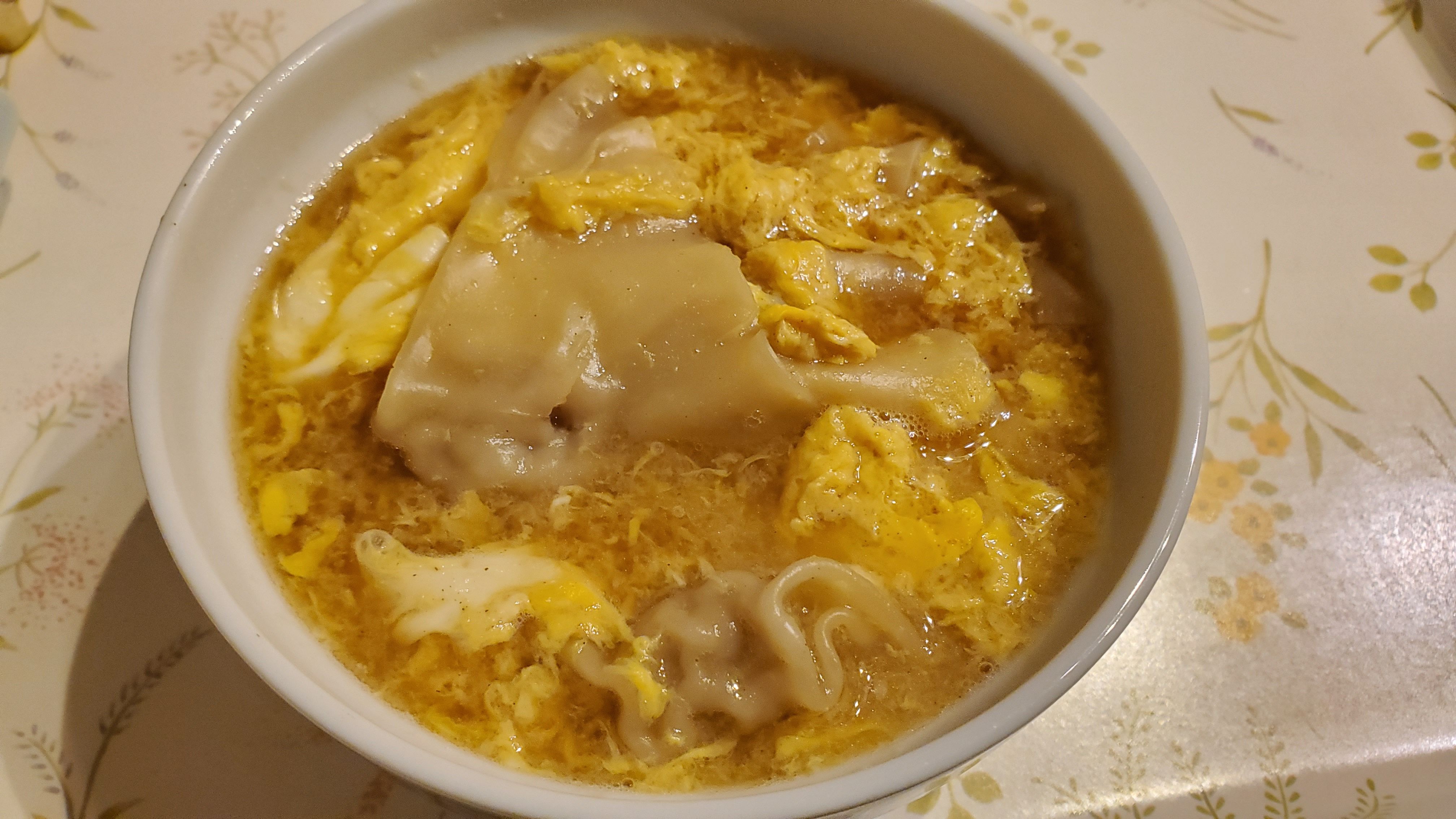 ワンタンスープ……先日食べた残りがあったので卵とじ……お汁系でもアルコールを飲める私です。