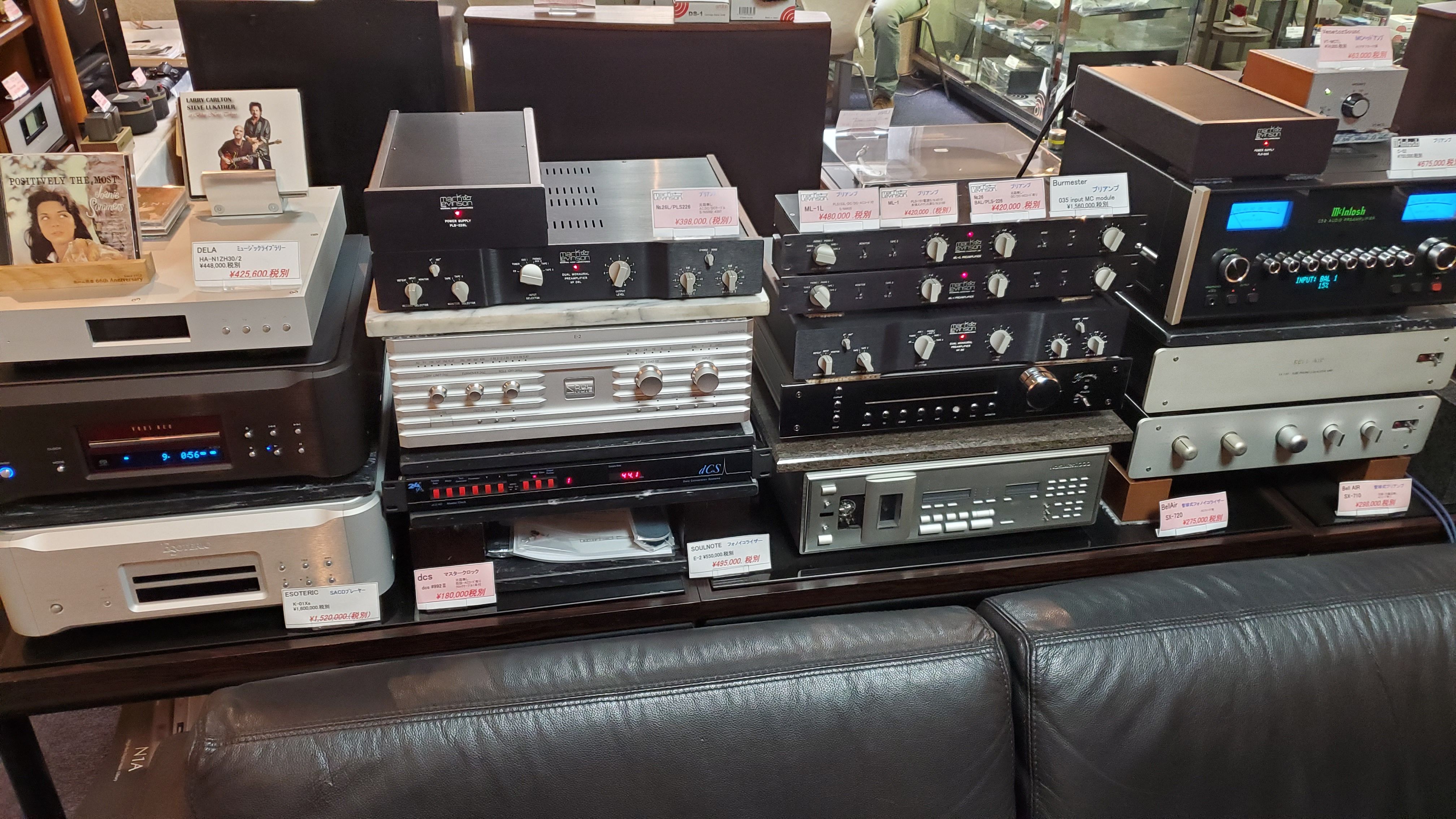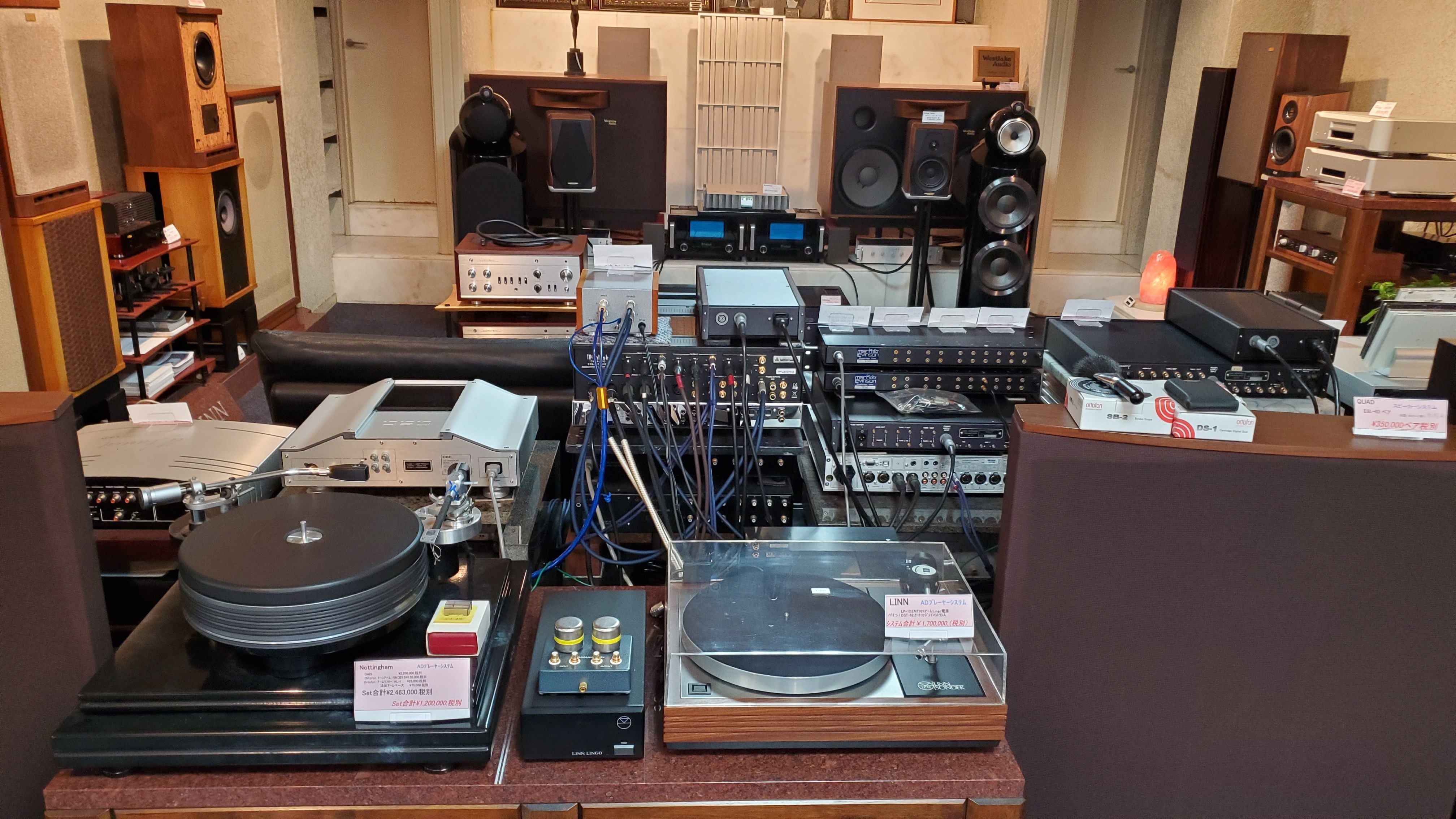 手前にならぶ2台のプレーヤーのうち、右の小さいLINNは170万円(税別)…欲しいけど私には買えません。以前は新品ばかりでしたが、買い替え・バージョンアップのお客さんから引き取った中古もならぶようになり、その数は今や膨大です。フロアーに置かれた物もあるのでつまずいたら大変なので、よそ見は出来ません。掘り出し物もありますが、残念ながら私には入手できません……
