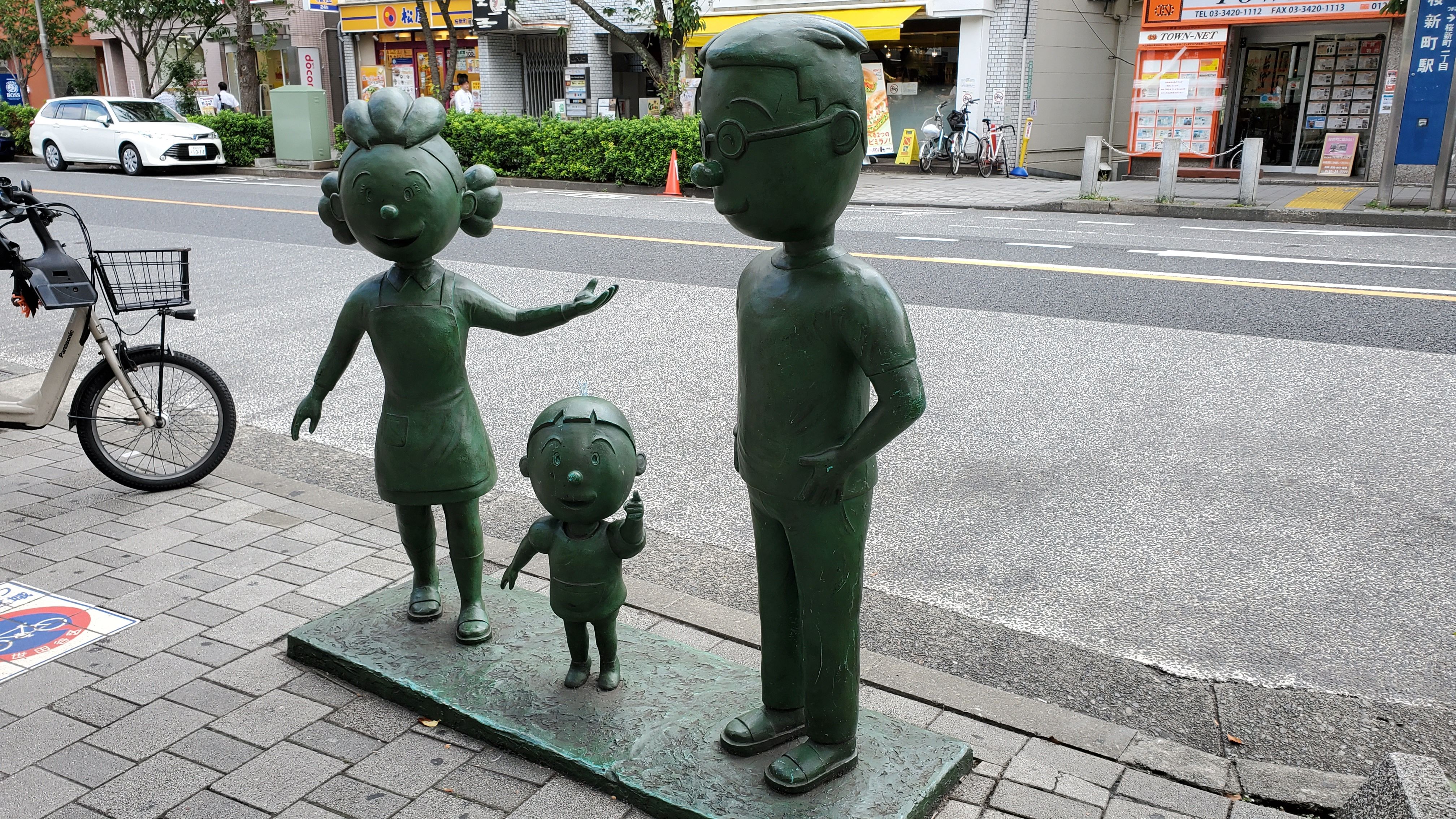 サザエさん一家……桜新町駅そば……「ボーっと歩いてんじゃねーよ!」とチコちゃんに叱られます。予定していた場所はもっと東なのに、こんな所に出ちゃいました。遠回りは承知の上でしたが、そもそも呑川緑道を使ったのがいけなかったと反省……