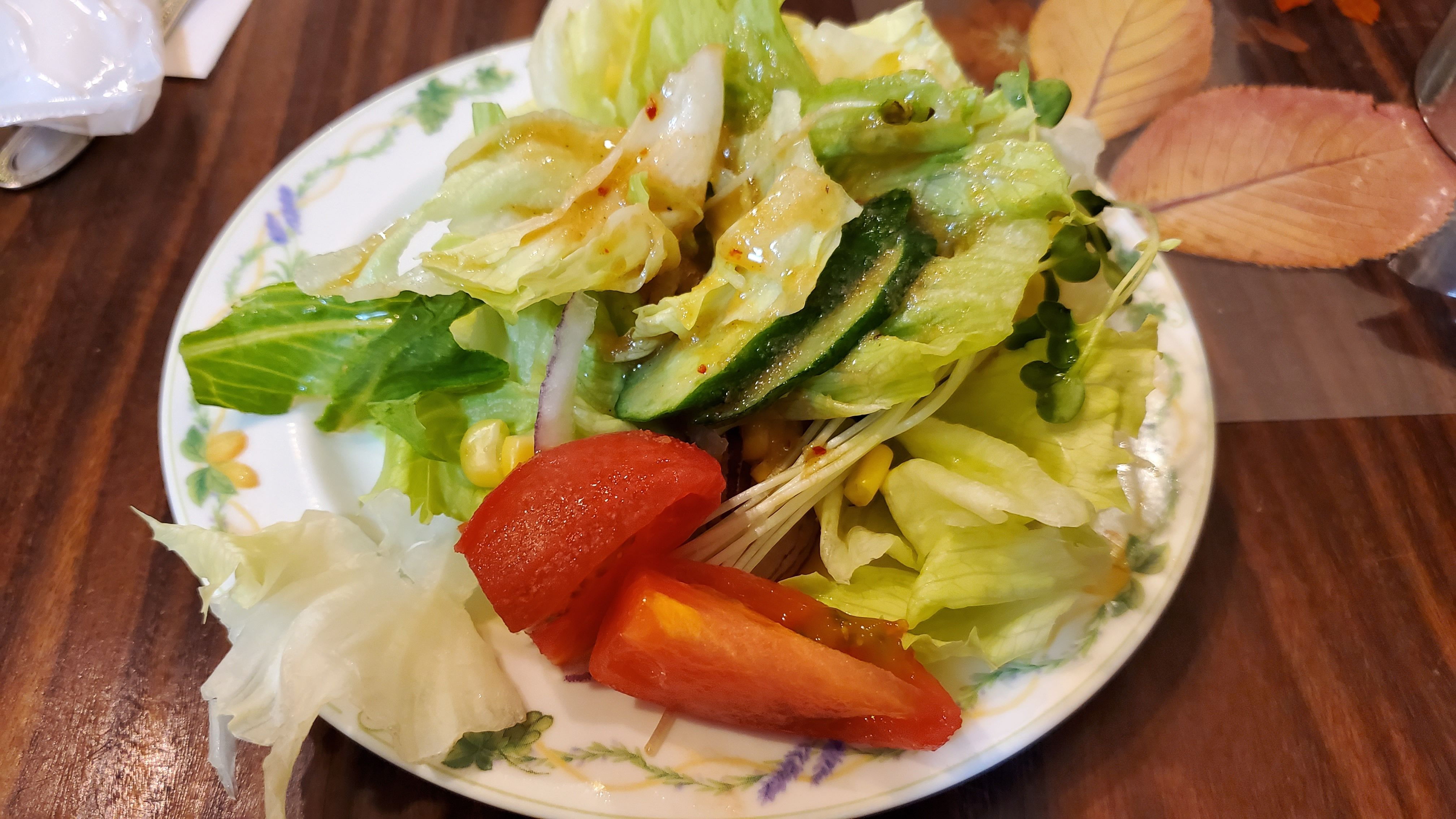 相変わらずの大盛サラダ……なにも言わなくても和風ドレッシングにしてもらえるようになっています。ありがたやありがたや……