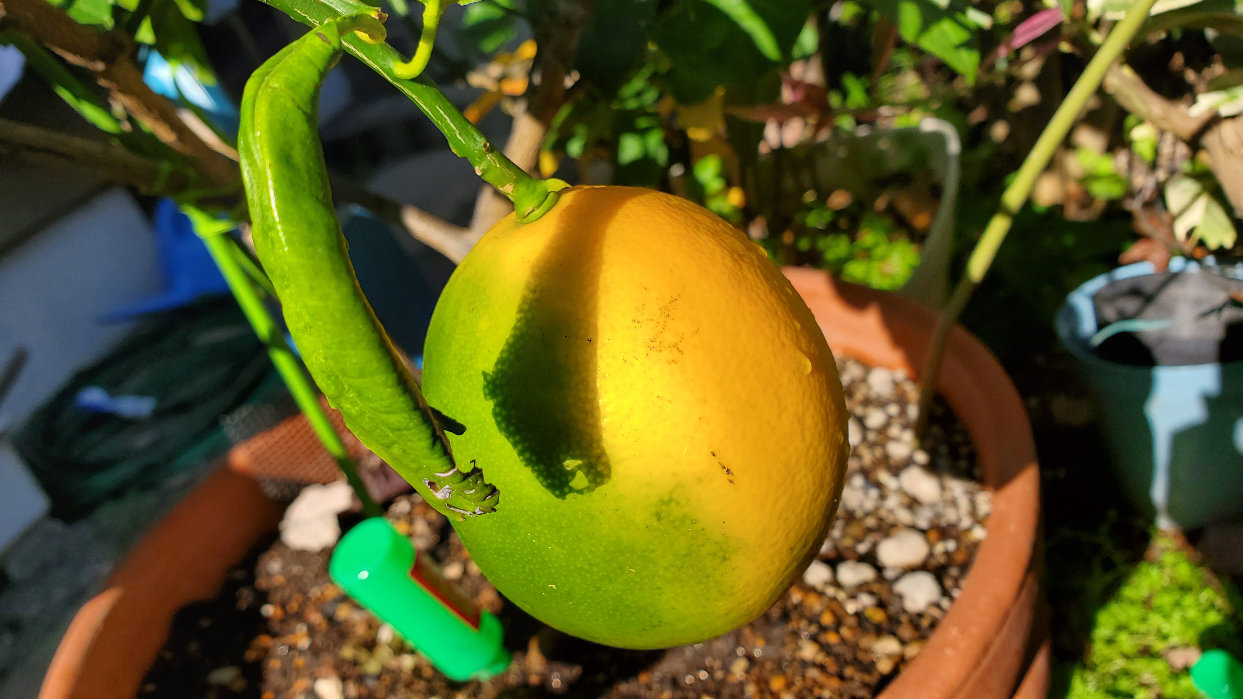 レモンも巨大になりました。けっこう重いのに、良く落ちないな~ と感心してしまいます。私は手を出しませんが、 全体が黄色くいなるまで収穫を待っているようです。
