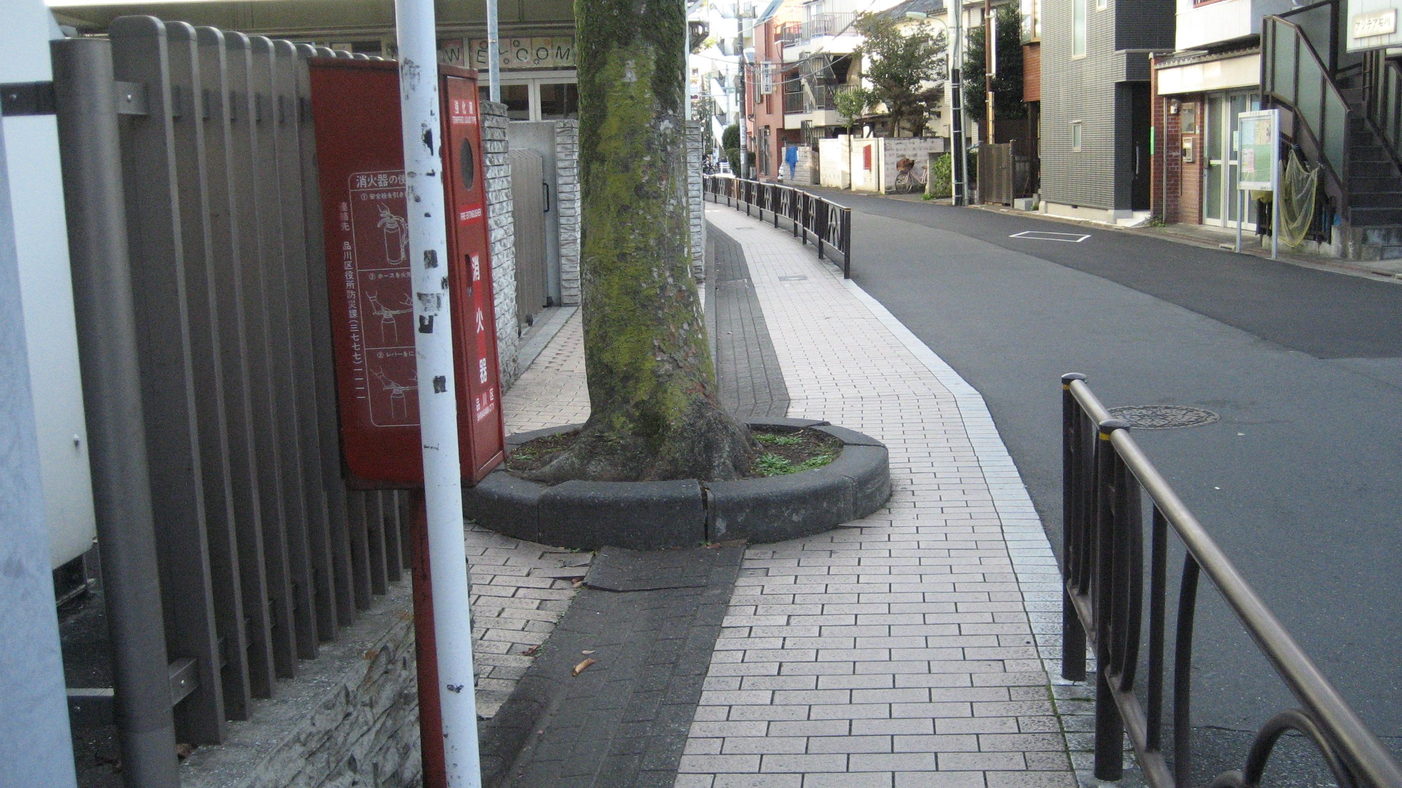 また邪魔……目の不自由な方は困ると思います。樹木も大切だけど、ここに存続させる必要があるのかしら? 双子用の横並びベビーカーだったら通れないと思うんだけど…