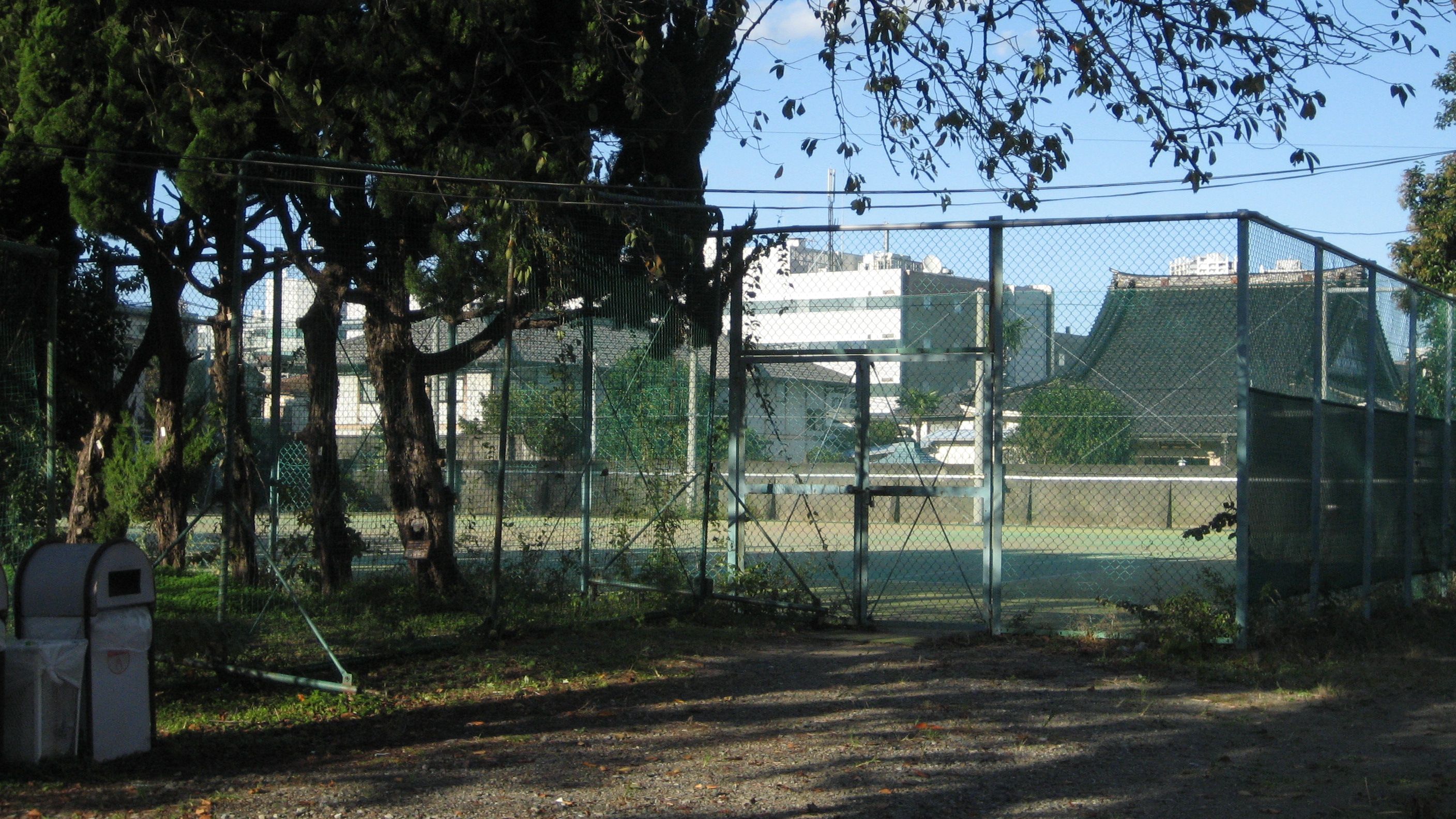 でもって フェンス隙間から覗いたら薬科大学のテニスコート……その向こうに見えました…先日訪問した長應寺の屋根が……