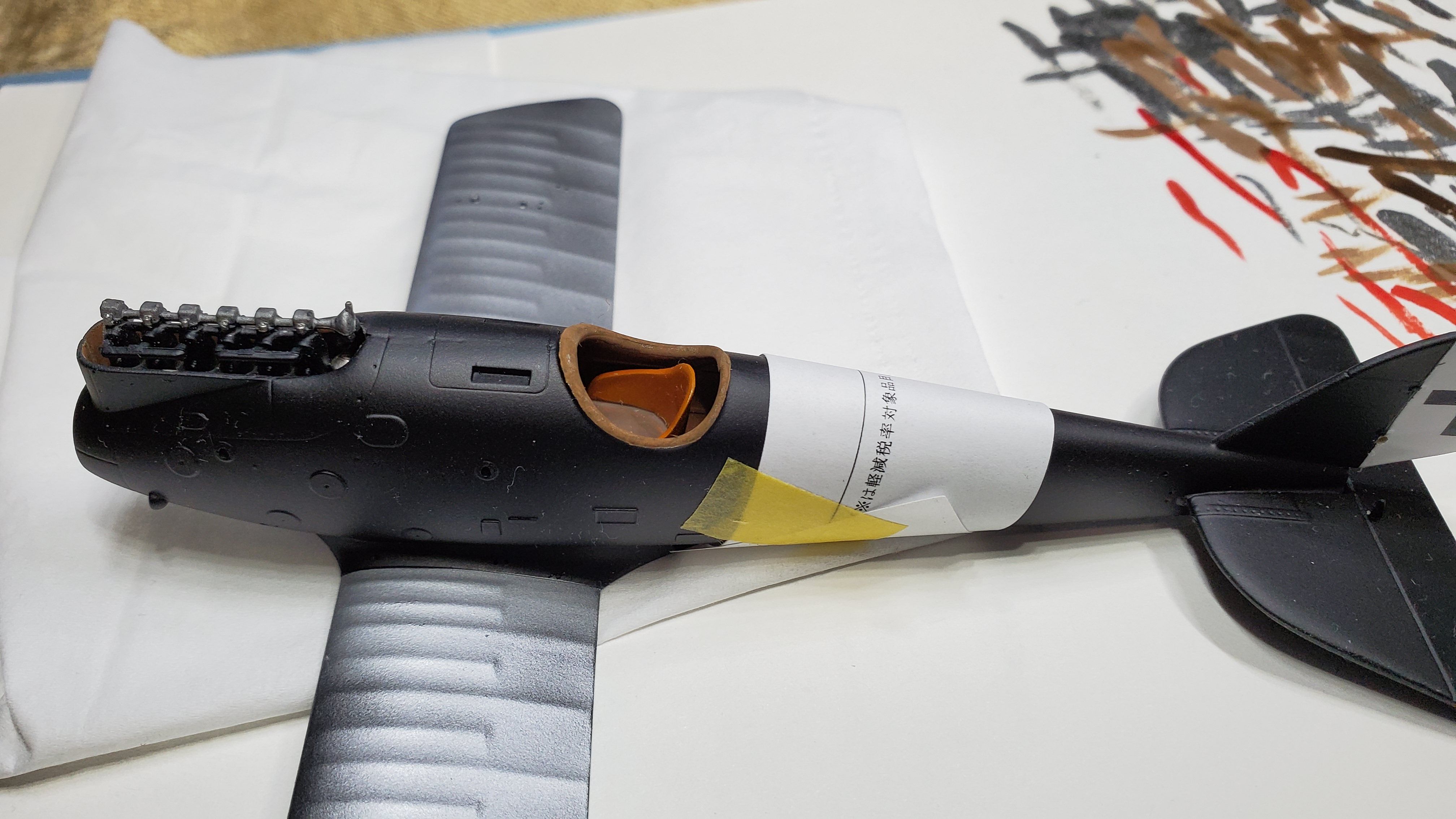 紙を巻いてあるのはデカール保護です。機銃と排気管がまだなので、天気の日にやっつけておかなければ……糸はまだ遠いです。
