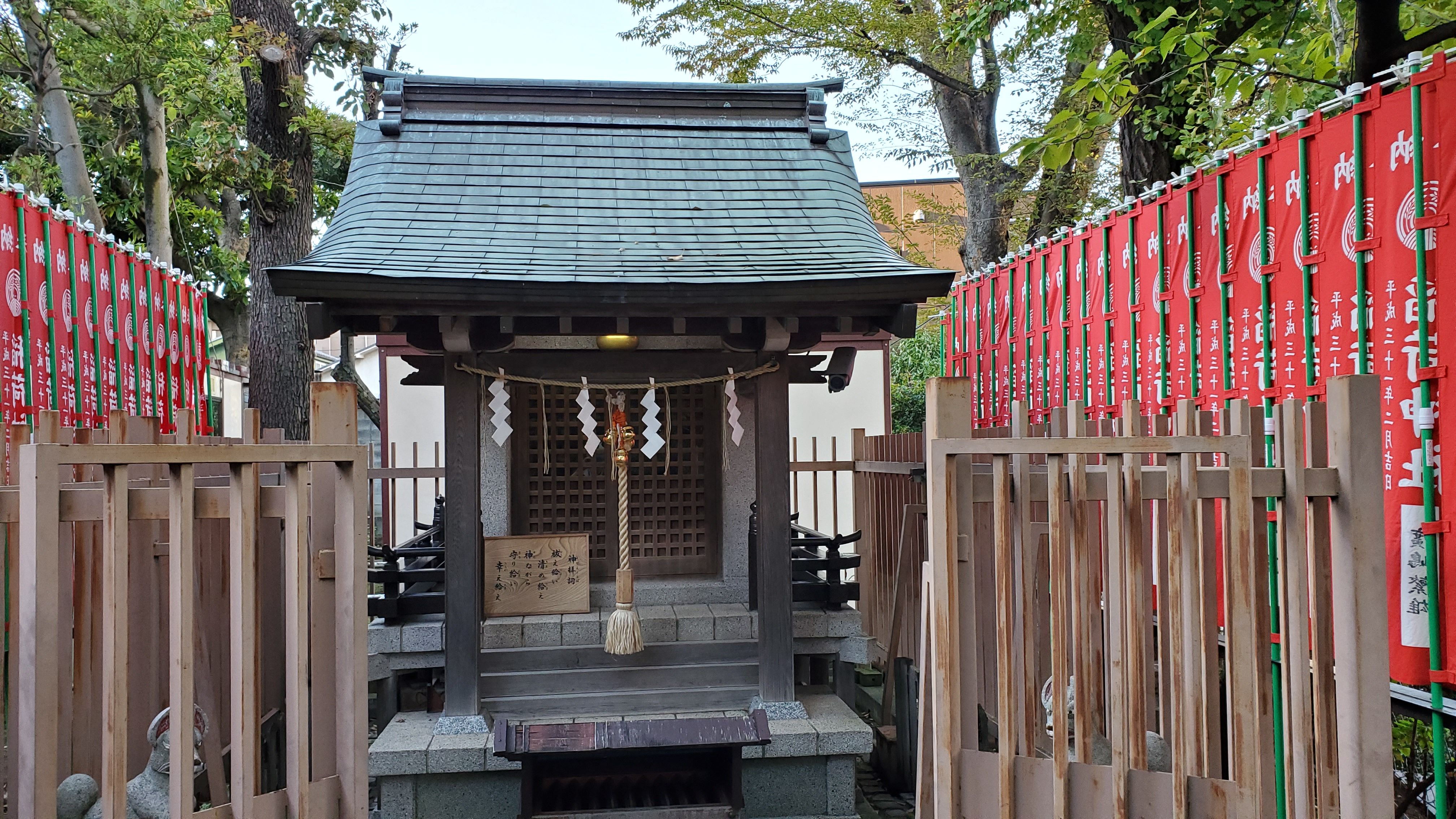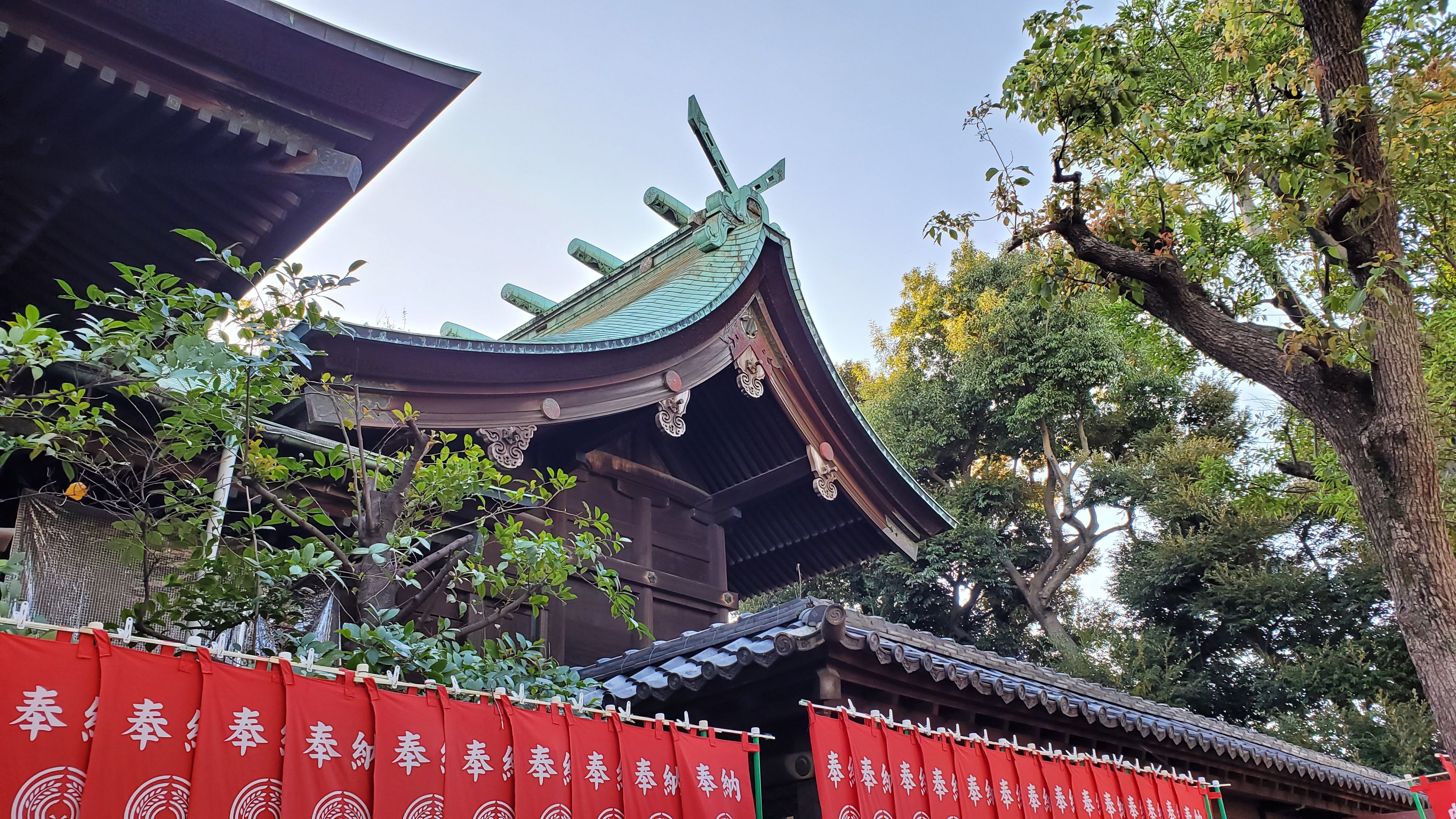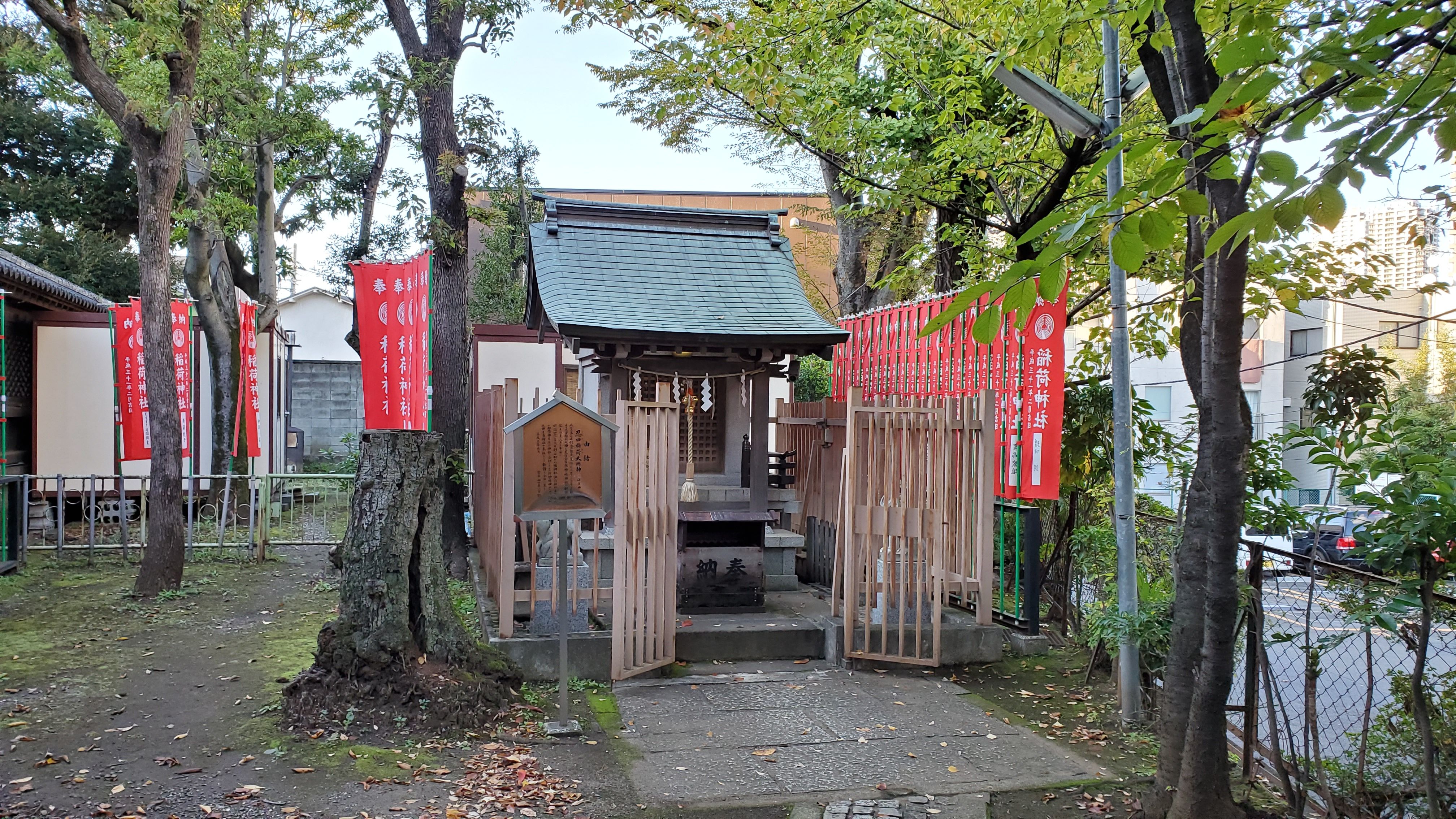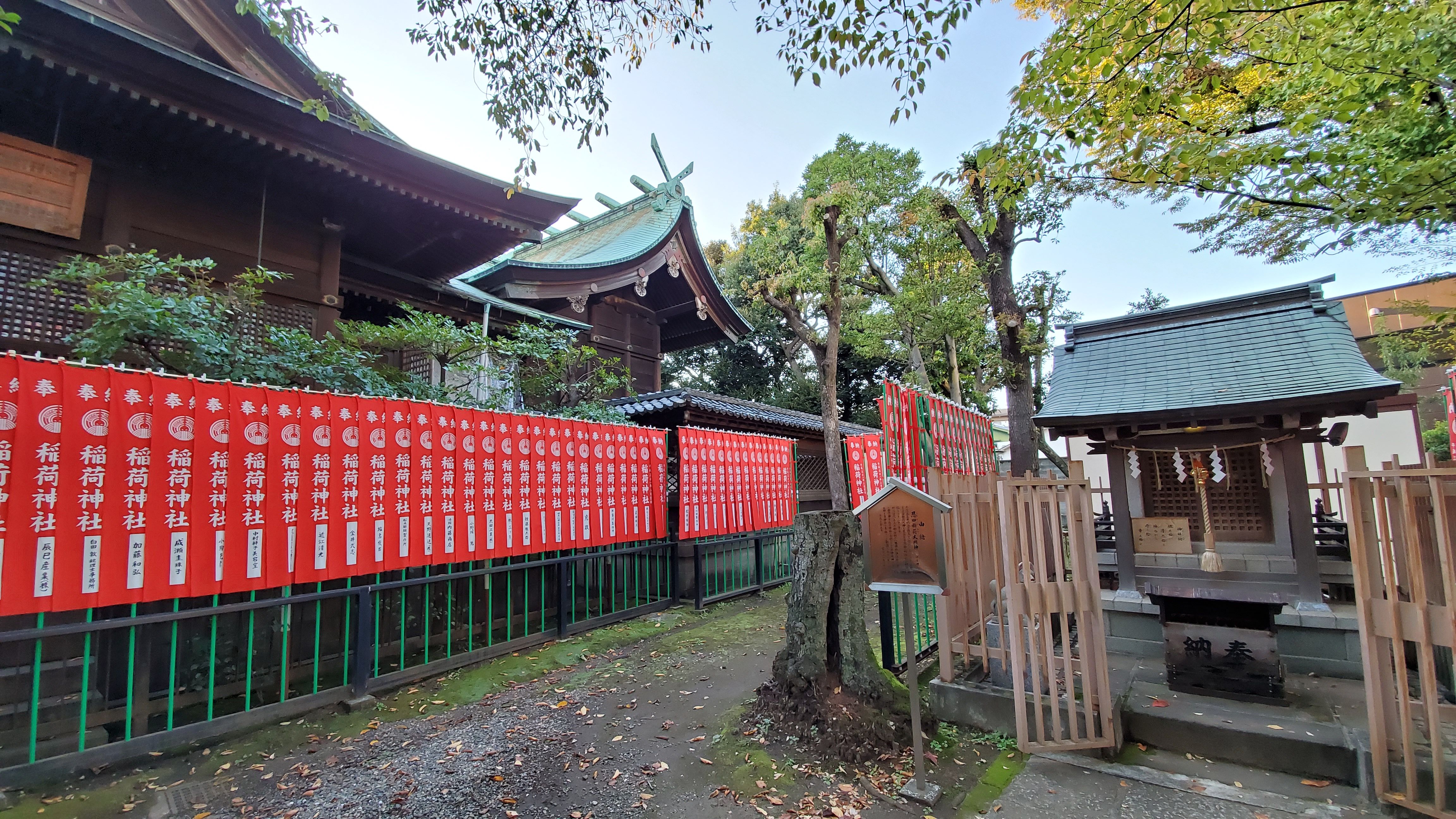 氷川神社を拝見して、社務所前で一服しながら「帰り道はあっちで良さそう」と眺めていたら赤い幟が目に入りました。