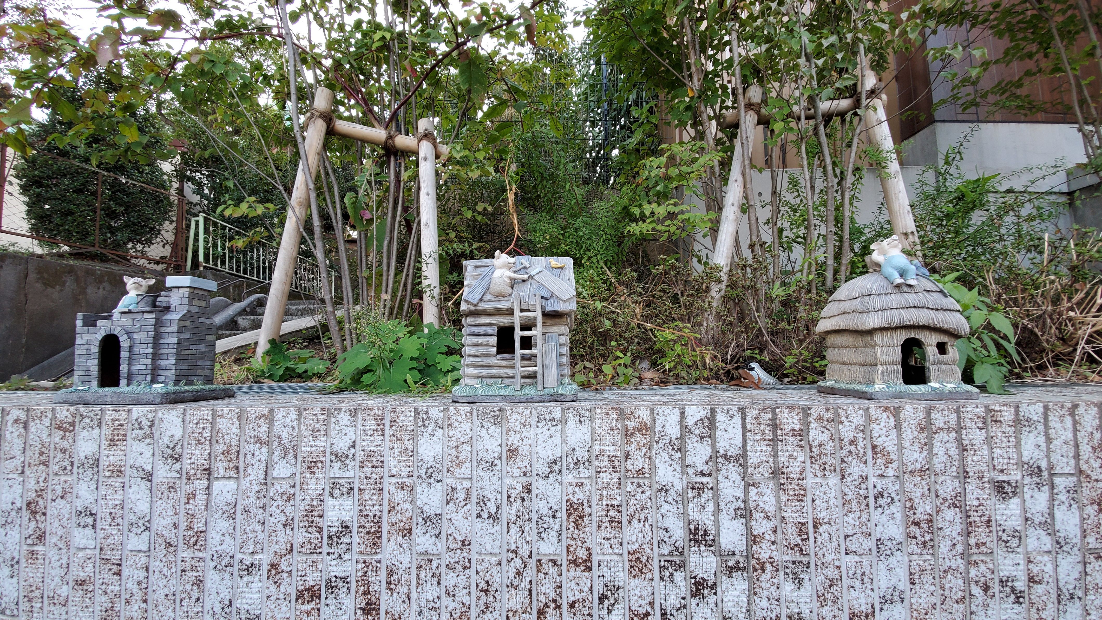 塀の上にありました。右から、ワラ、木、レンガ……三匹の子豚でしょう。オオカミは見ませんでした。