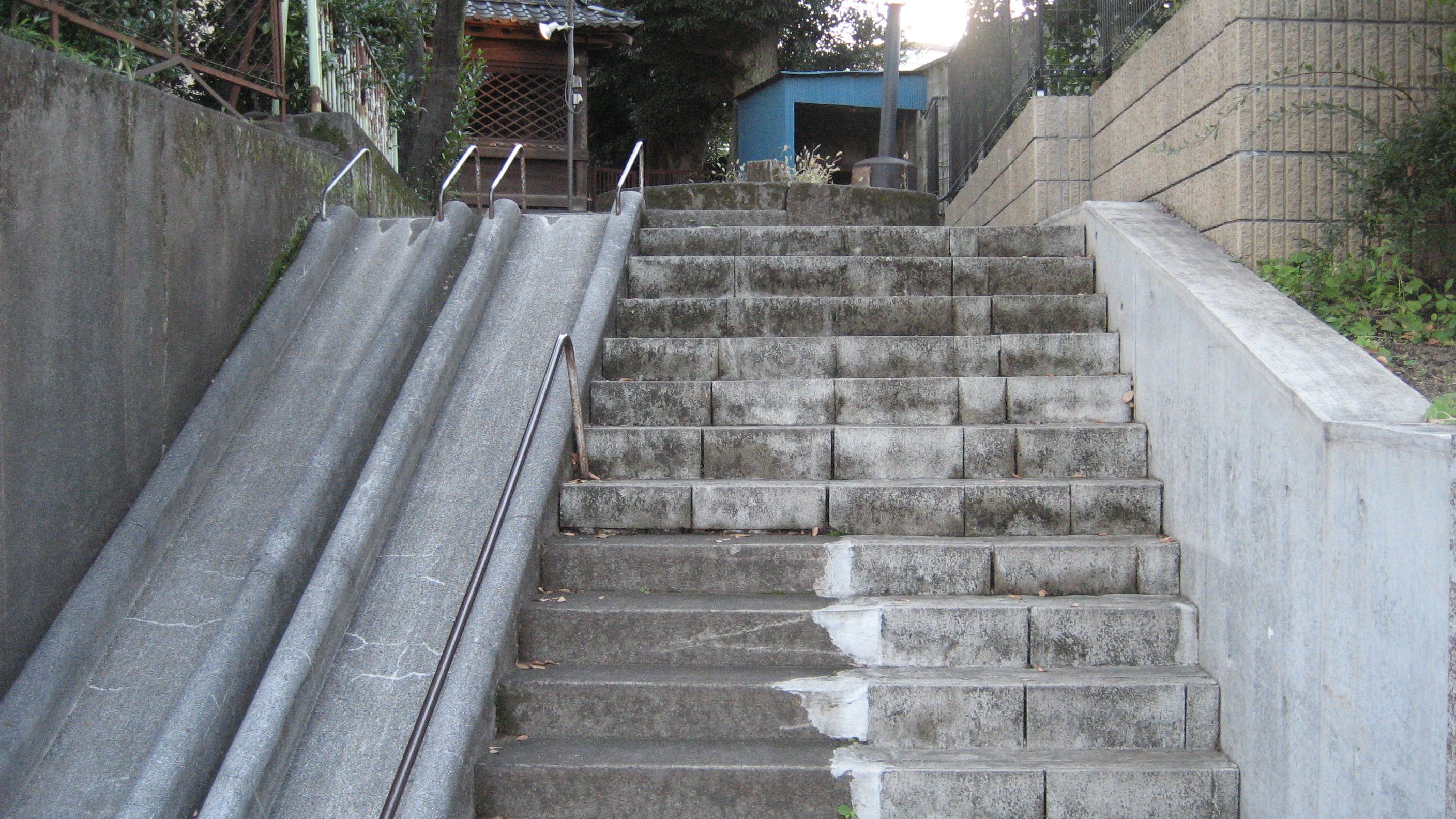 帰路につくべく社務所から眺めた道を行ったら、ちょうど忍田稲荷大明神の後ろにこんなの……どう見ても「滑り台」……なんで??? 子供の遊び場があるのかと上ってみましたが焼却炉があるだけでした。幼稚園を運営していたのかもしれませんね…