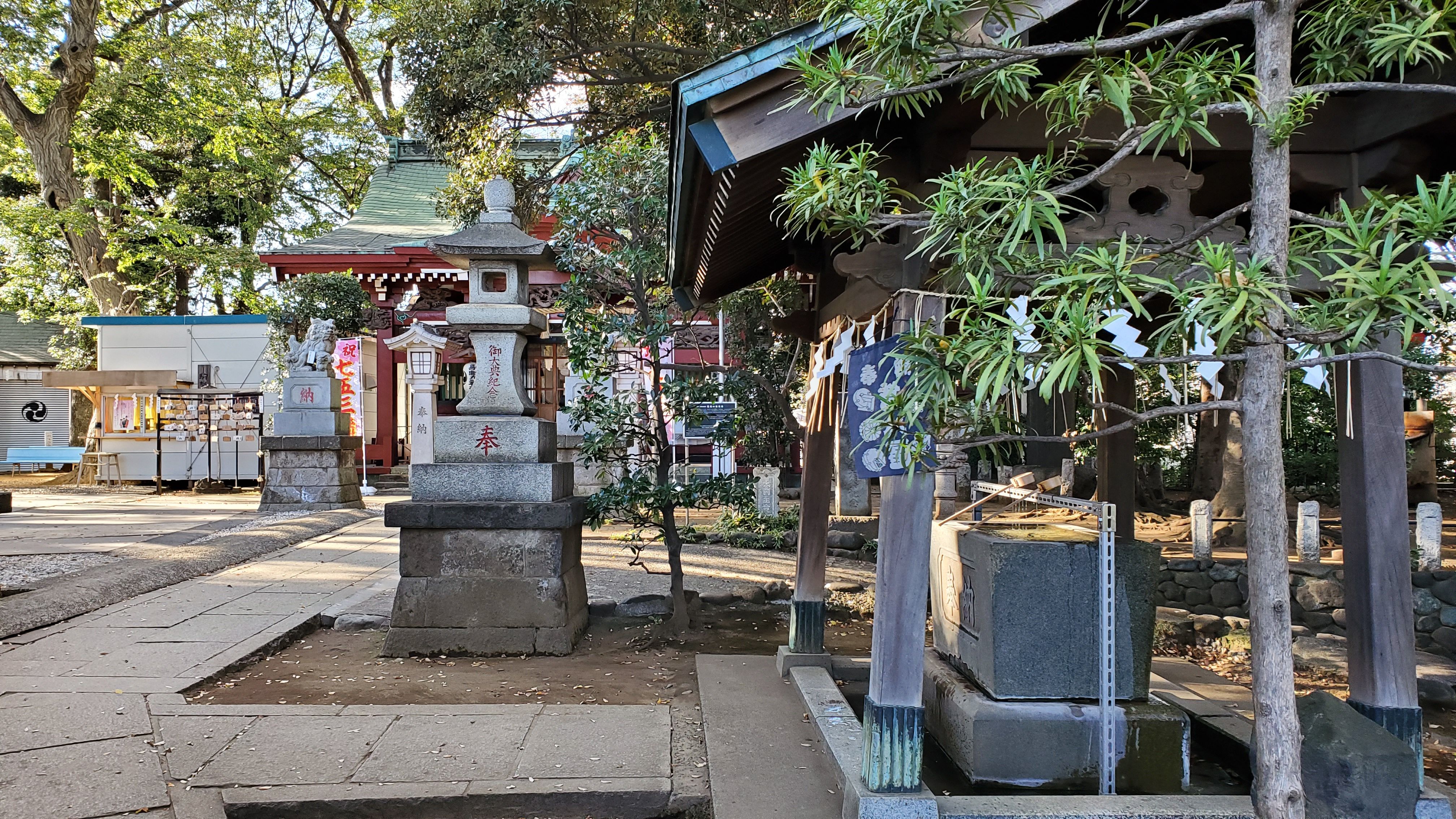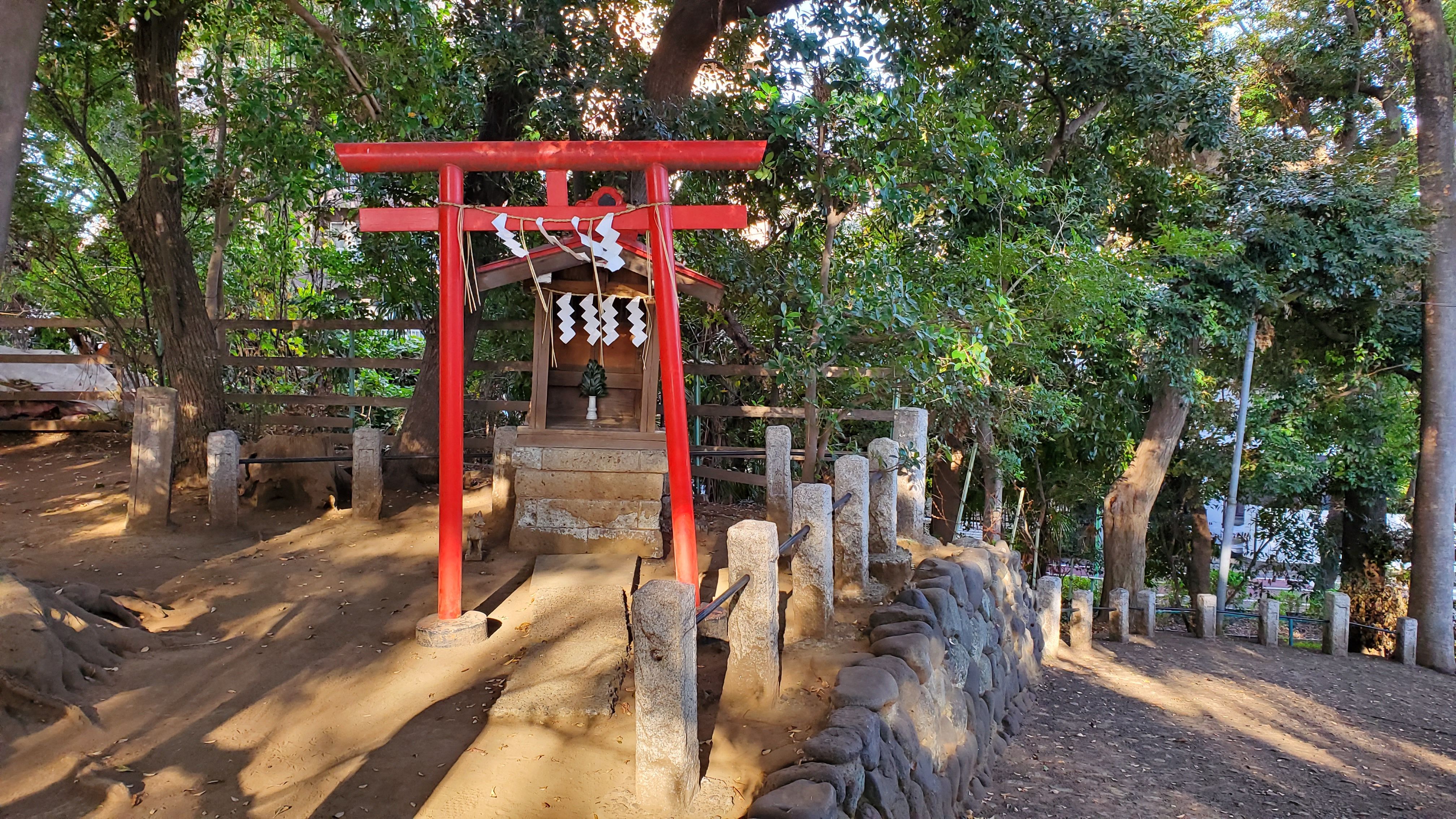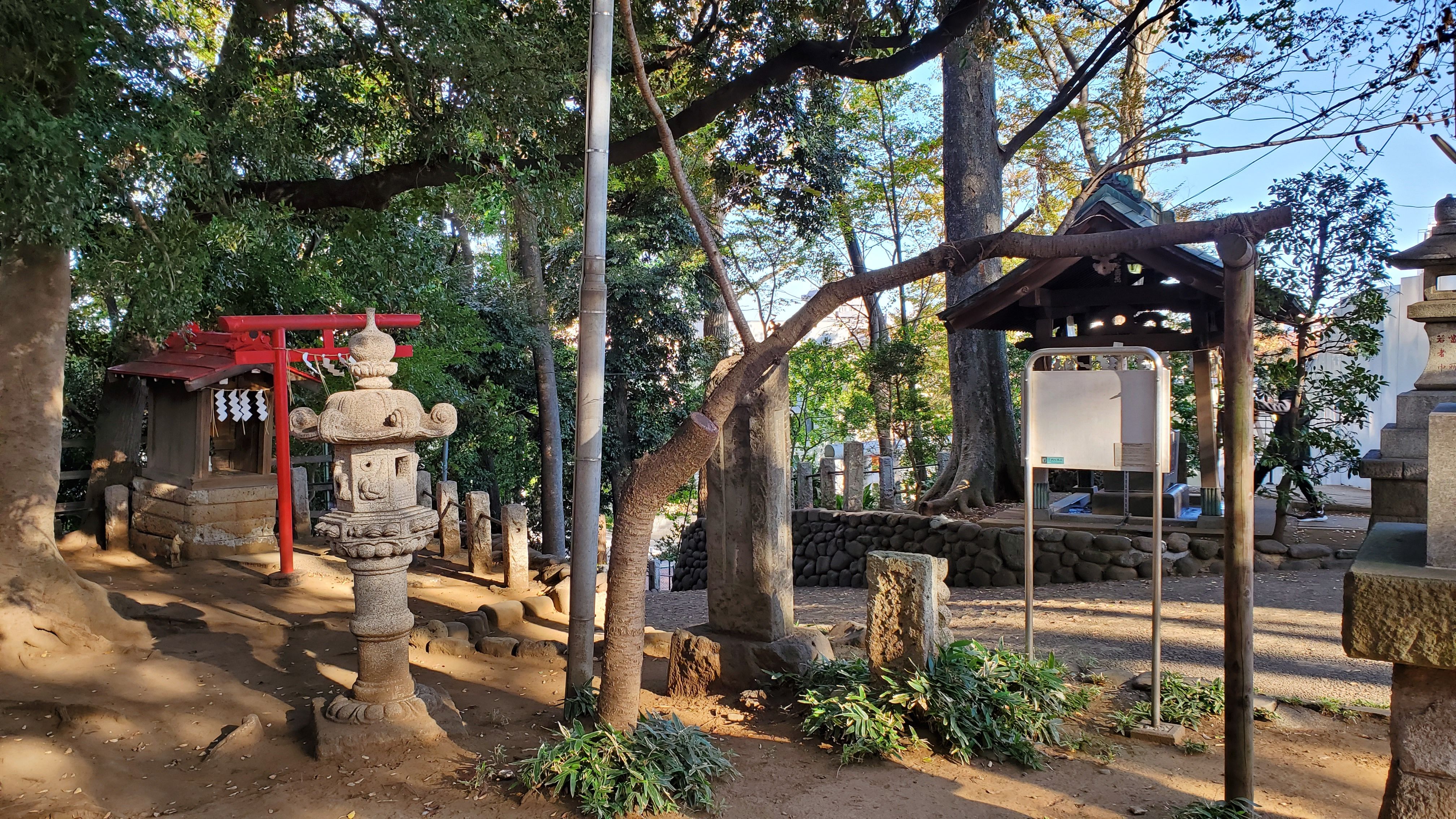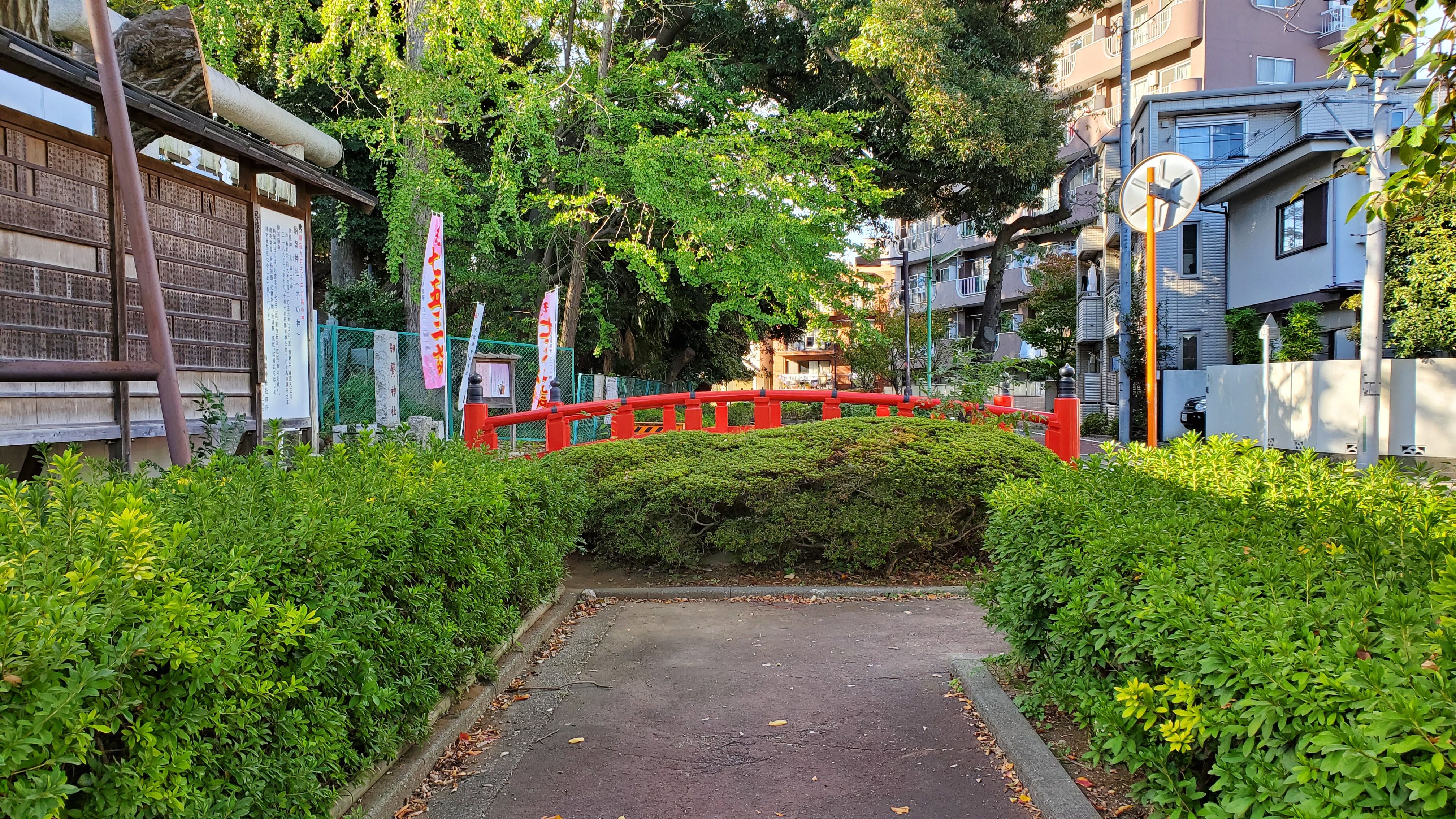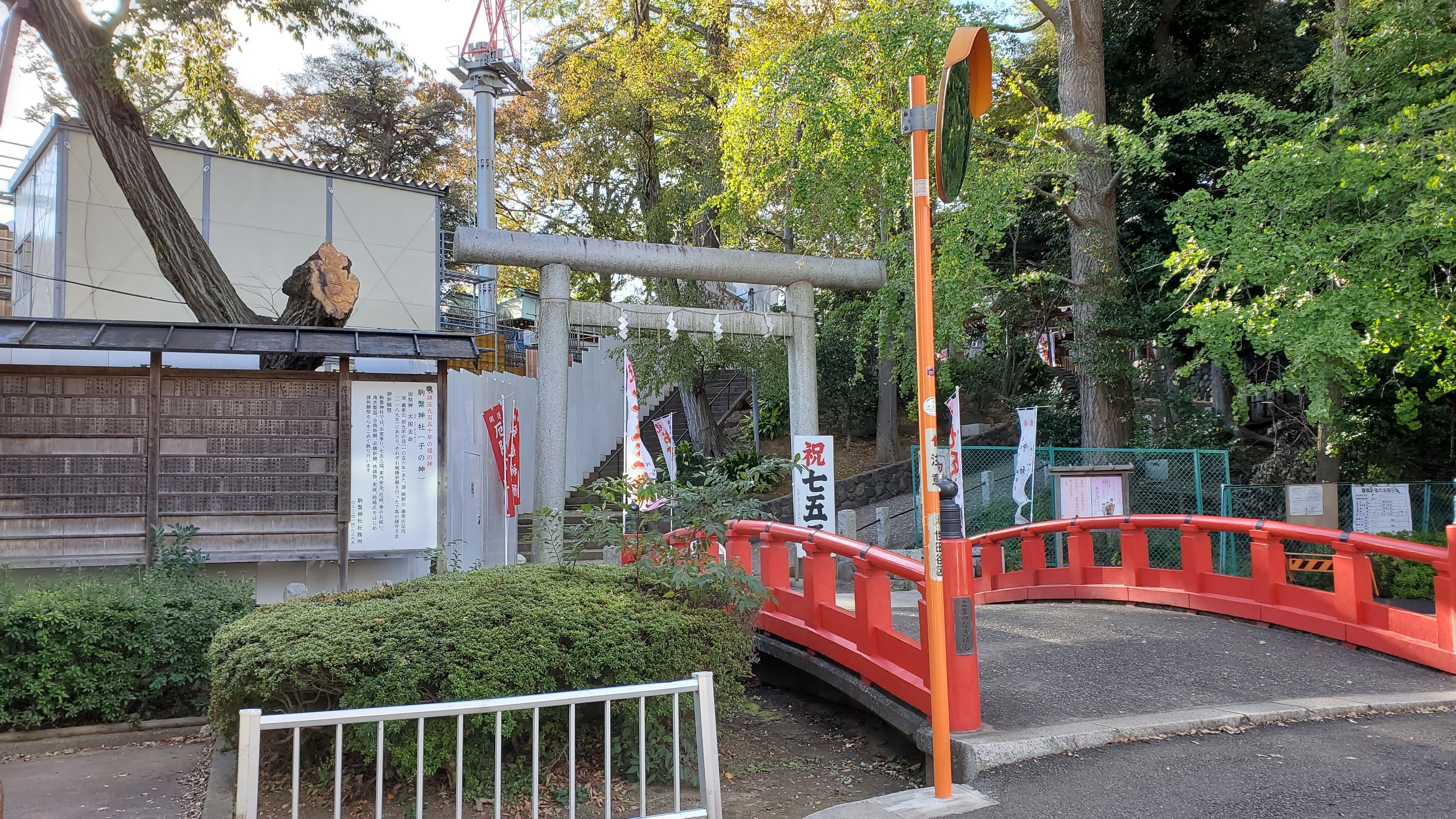 朱色の橋…… 昭和26年に架けられた、 神橋って言うそうです。蛇崩川が暗渠になっても残っていますが、参道入り口にはよく似合います。暗渠ではない丸子川沿いの [善養密寺]にも赤い橋[大日橋] ​が架かっていましたっけ……