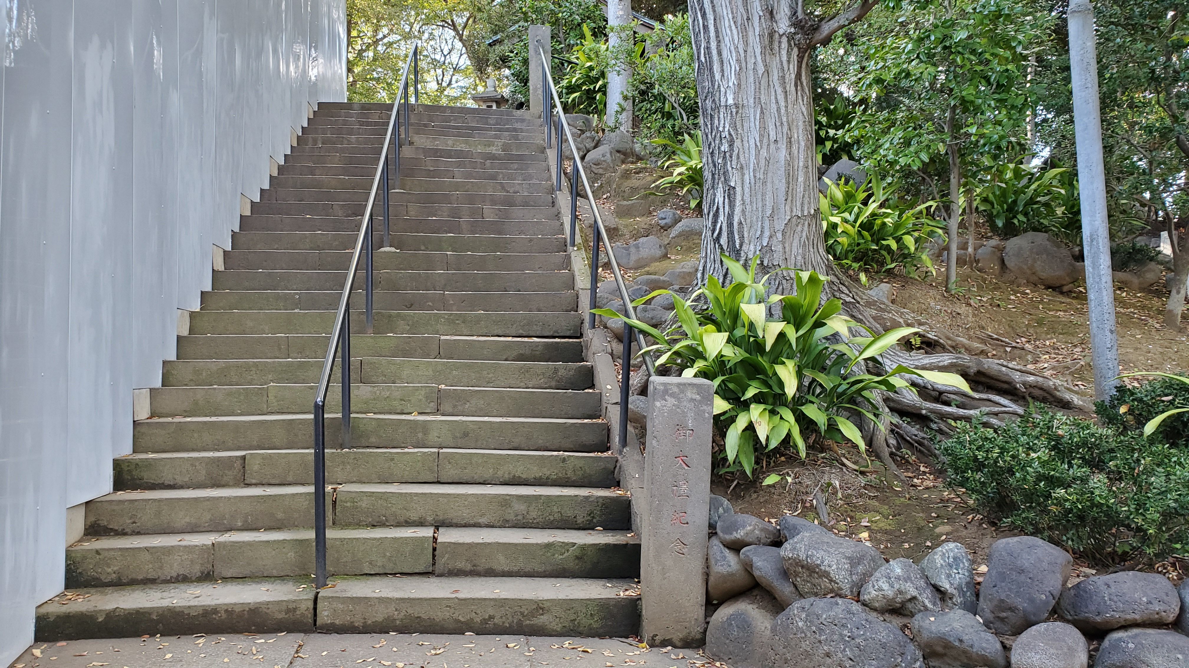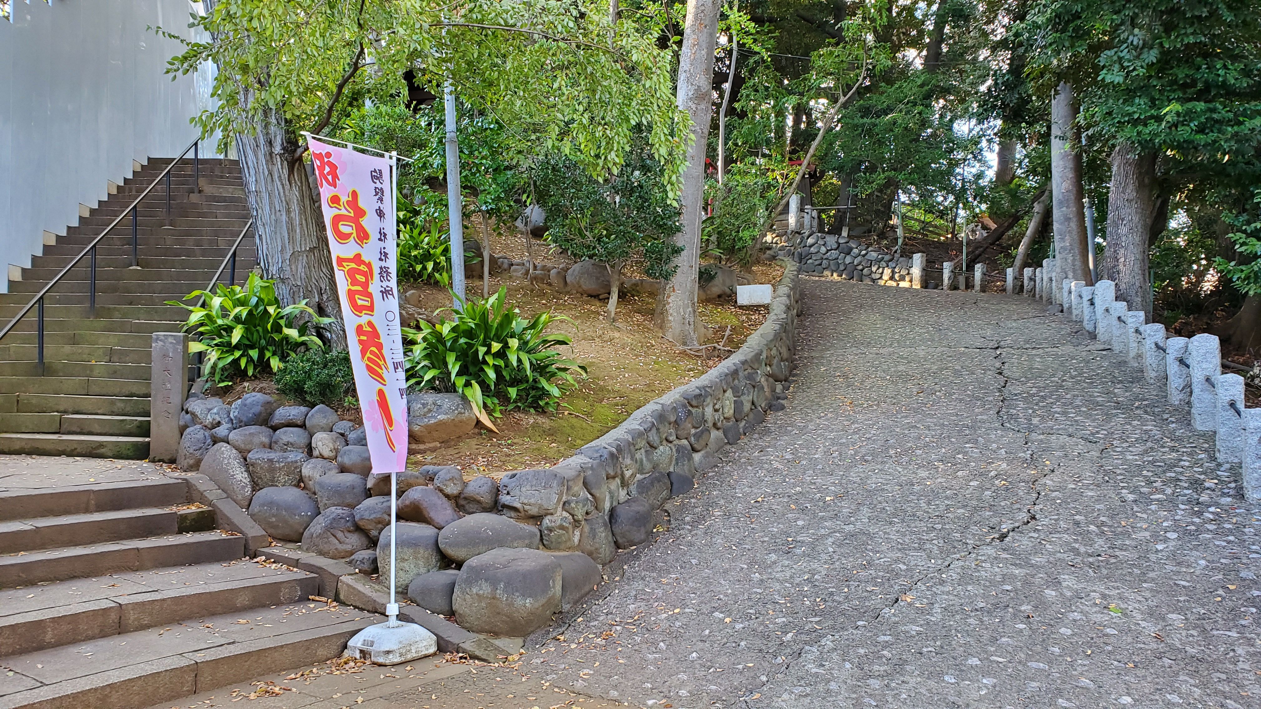 鳥居をくぐると二股……スロープと石段……車椅子やベビーカーも押して上れる優しさ……