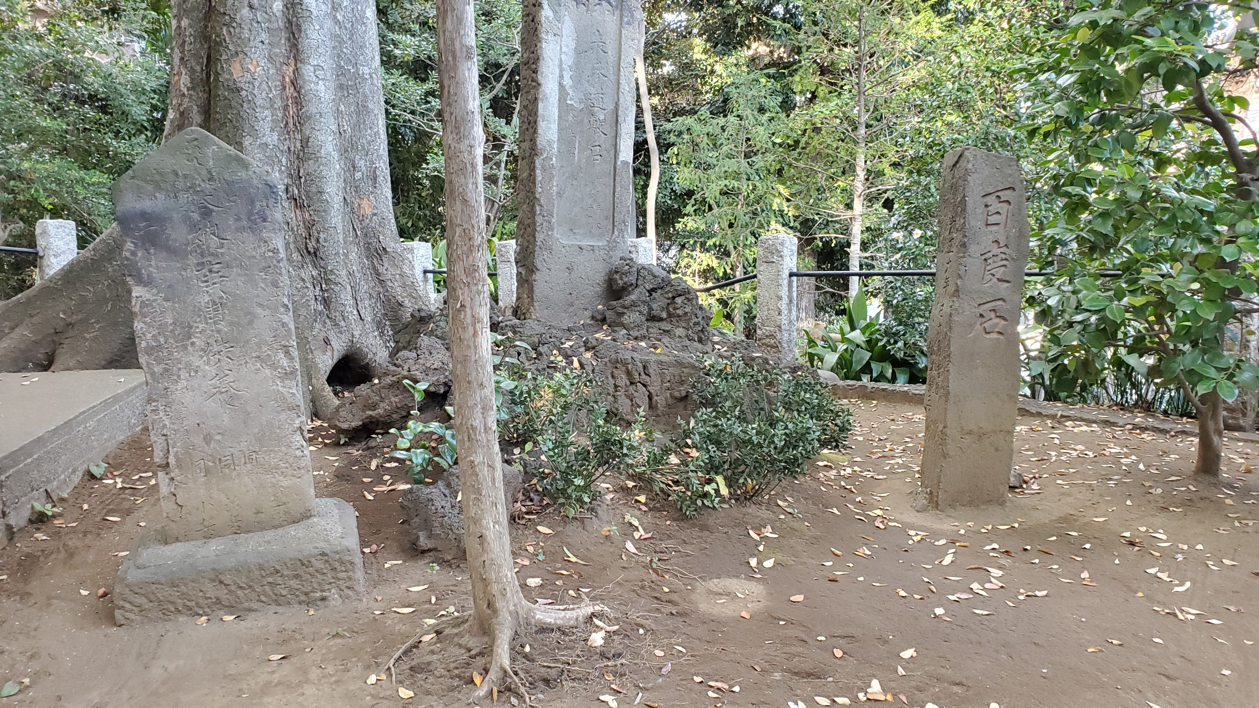 右は百度石、左は庚申塔でしょう。中央奥のは[表参道敷石]と読めました……改修工事の記念碑みたいなものかしら?