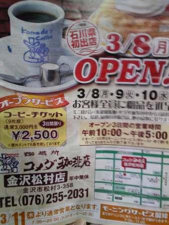 昨日から、新聞にチラシが入っています。とうとう、名古屋のコメダ珈琲店が金沢に出来ました!!ケンミンショーで見た事はありましたが、まさか金沢に出来るなんて。2号店も、近々オープンの予定だそうです。リランさん、見てくれてるでしょうか。場所はKTMさんが、いつも行かれる示野イオンの近くですから。チラシにメニューも出ているのですが、どれも美味しそう。中でも気になるのがあるんです。下の方にある、瓶の絵。コーヒーシェイクとサマージュースって、何でしょうか。瓶にフタもしてあるみたいな。初めてみます。ケンミンショーで紹介されていたのが、シロノワール??。これもまた、美味しそう。ソフトクリームが乗っているんですって。グラタンも美味しそうだし、ホットドックも。喫茶店なのに、これだけメニューがあって。すごいなあ。ガストとは、全然違う雰囲気。明日にでも行きたい位。10日は友達とランチの予約が入っているし。もうしばらくしてから、絶対に行きたいです。コーヒーは、美味しいんでしょうね。お代り自由とかじゃないですよね。モーニングには、卵と半トーストがつくらしいですよ。久しぶりの更新が、食べ物ネタ。確定申告、追い込み中のkimikanでした。