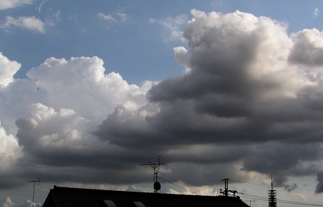 西の空見あげたら黒い雲モクモク午前中はこのような青空でしたのよ! 午前中素晴らしい青空に白い雲!お使いに行き、帰りは黒い雲・・・昨日は雷の被害書きまして、皆様よりお見舞い頂き有難うございました。但し被害の後編? がありました。今日買い物に行きましょうと、駐車場の電動シャッター開けようとしましたら、開きません!!雷の悪戯です。施工者の会社に電話しましたら、お盆休みとかで通じません!手で横開きのドアをガリガリこじ開け、車だしています。 でも我が家良いほう、お店で偶然近所の奥様にお会いし、瓦斯電気器具全部、当然パソコンも!地震保険入っていましたからよかったです。 ウンン?? 私は地震保険お高いからと言って入っていないのです!家ぐらいの被害で助かりました。(溜息)
